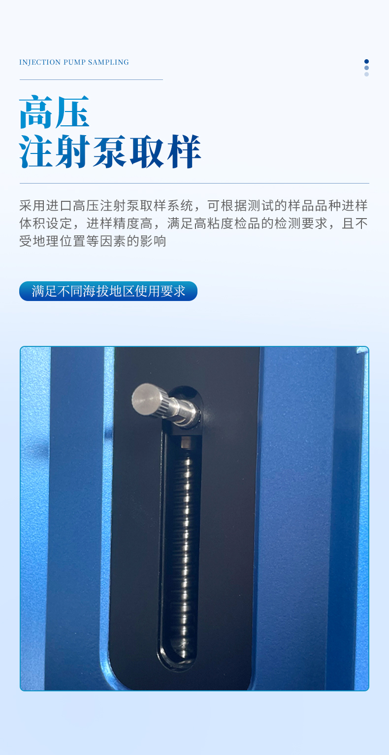 ●采用進口高壓注射泵取樣系統,可根據N試的樣品品種進樣體積設定,進樣精度高,滿足高粘度檢品的檢測要求,且不受地理位置等因素的影響,滿足不同海拔地區的使用要求。