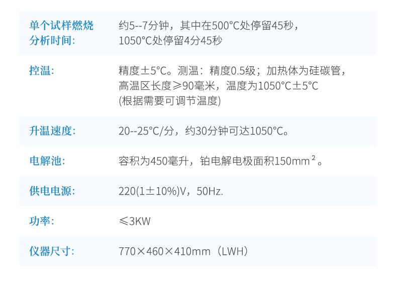 2、 單個試樣燃燒分析時間:約5--7分鐘,其中在500℃處停留45秒,1050℃處停留4分45秒。