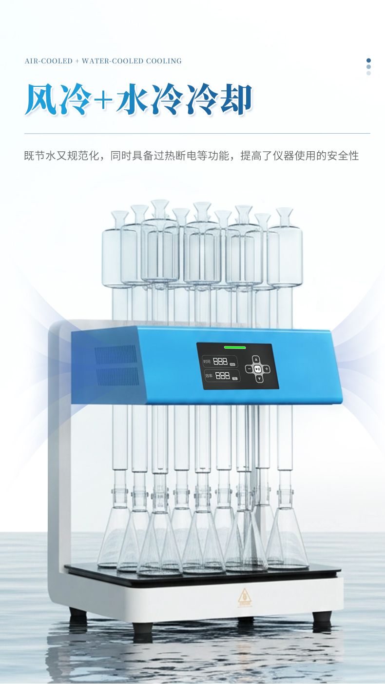 3. 安全性能優(yōu):采用玻璃毛刺回流管代替球形回流管,并以風冷+水冷技術取代傳統(tǒng)自來水冷卻方式,既可以節(jié)水又能使儀器規(guī)范化,同時具備過熱斷電等功能,提高了儀器使用的安全性。 4.面板易清潔:采用石墨烯加熱板,表面光滑、平整,表面污漬一擦即凈,可減少操作不當對儀器的損壞;