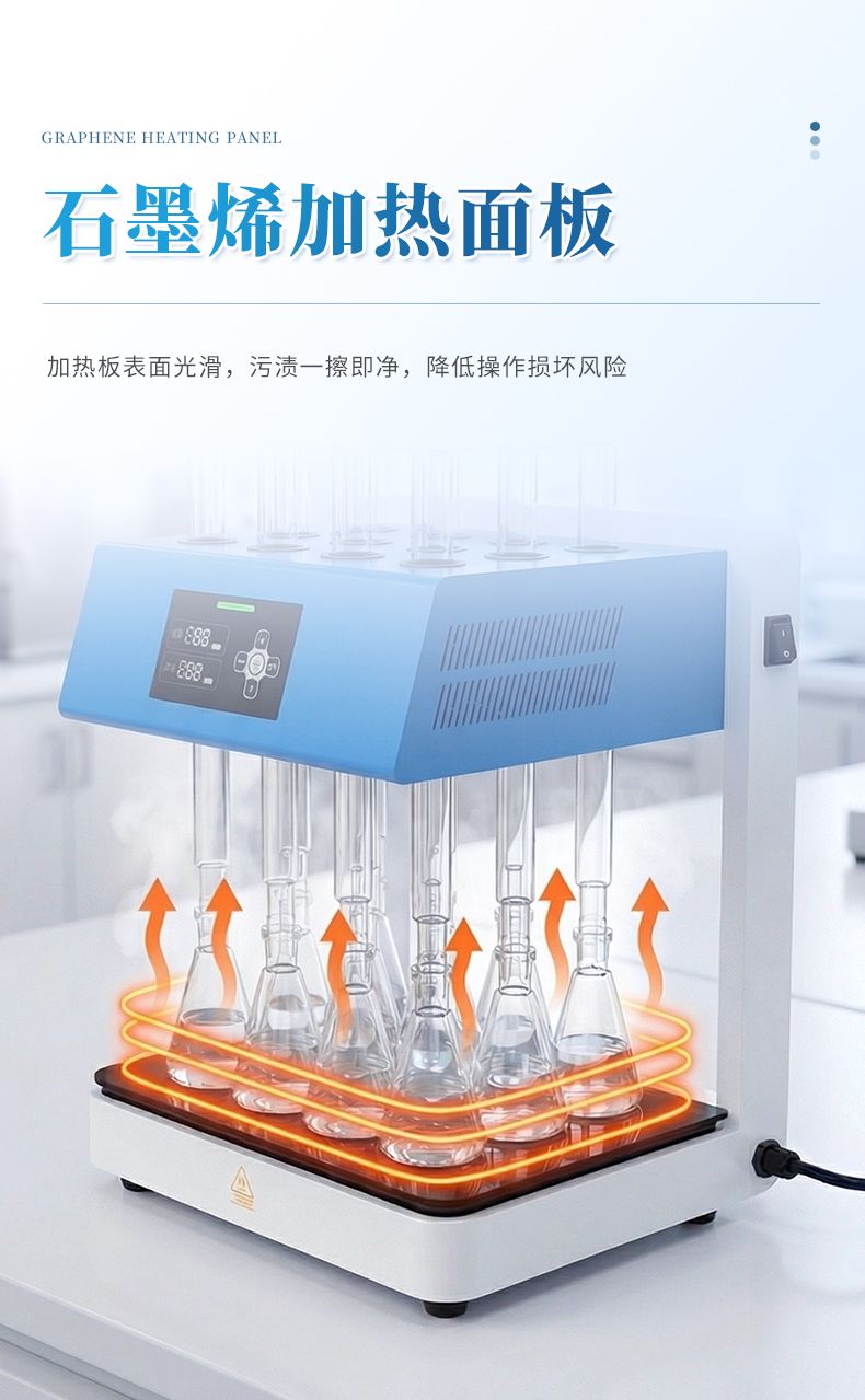 3. 安全性能優(yōu):采用玻璃毛刺回流管代替球形回流管,并以風(fēng)冷+水冷技術(shù)取代傳統(tǒng)自來水冷卻方式,既可以節(jié)水又能使儀器規(guī)范化,同時具備過熱斷電等功能,提高了儀器使用的安全性。 4.面板易清潔:采用石墨烯加熱板,表面光滑、平整,表面污漬一擦即凈,可減少操作不當(dāng)對儀器的損壞;
