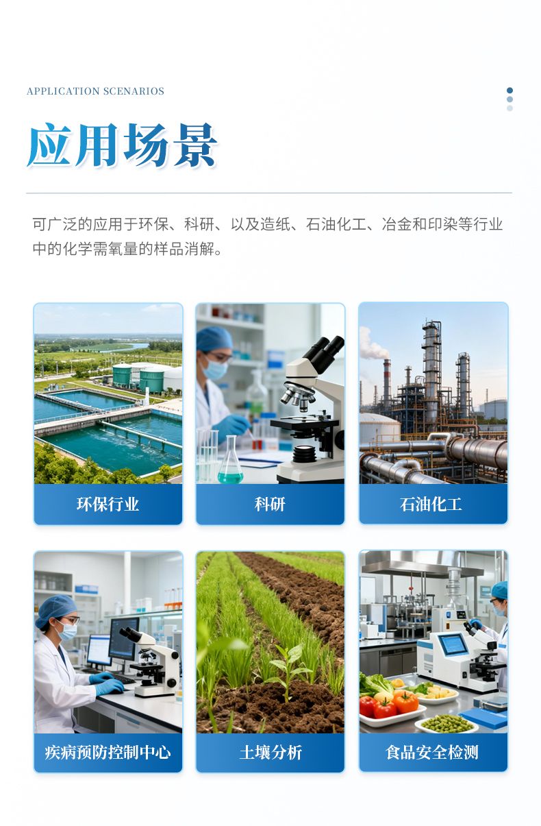 可廣泛的應用于環保、科研、以及造紙、石油化工、冶金和印染等行業中的化學需氧量的樣品消解。