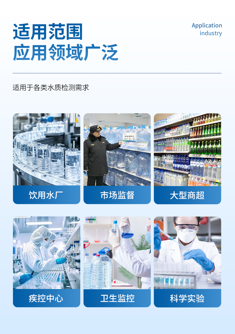 能夠廣泛的應用于飲用水廠生產檢驗、市場監(jiān)督部門質量監(jiān)督、大型商超質量抽檢、疾病控制中心、衛(wèi)生監(jiān)控等。