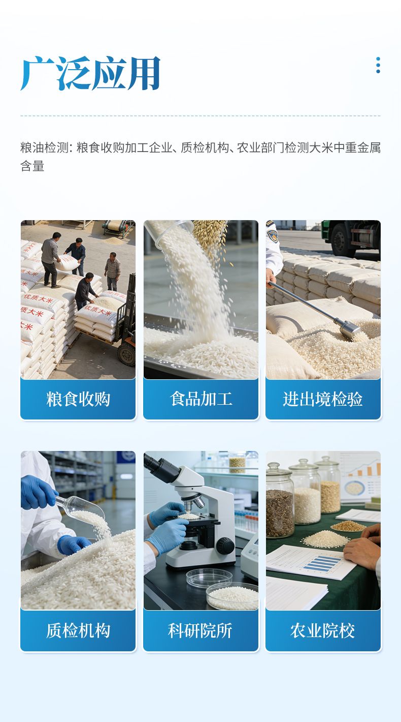 糧油檢測:糧食收購加工企業、質檢機構、農業部門檢測大米中重金屬含量。