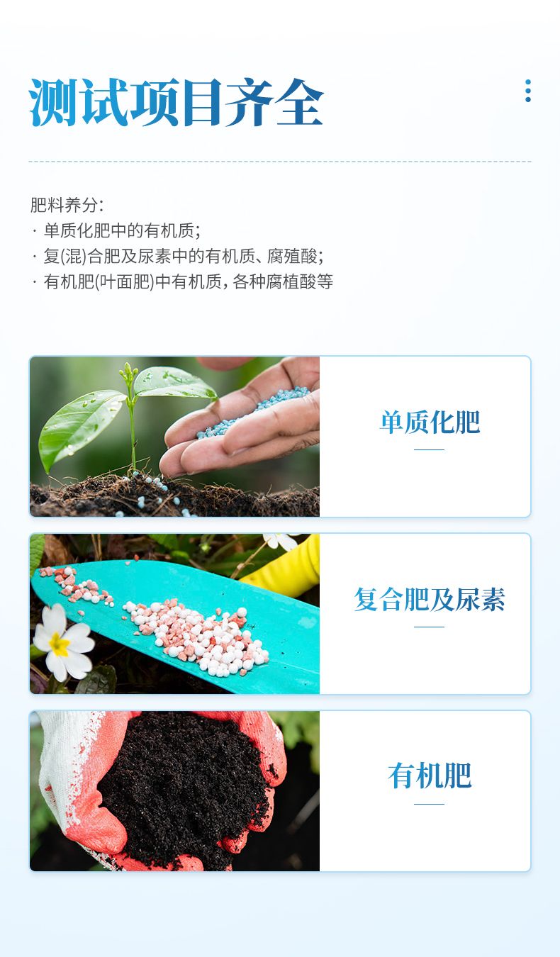 ★可檢測(cè)單質(zhì)化肥、復(fù)(混)合肥、尿素、有機(jī)肥(含葉面肥、水溶肥、噴施肥等)中的有機(jī)質(zhì)、腐殖酸含量。