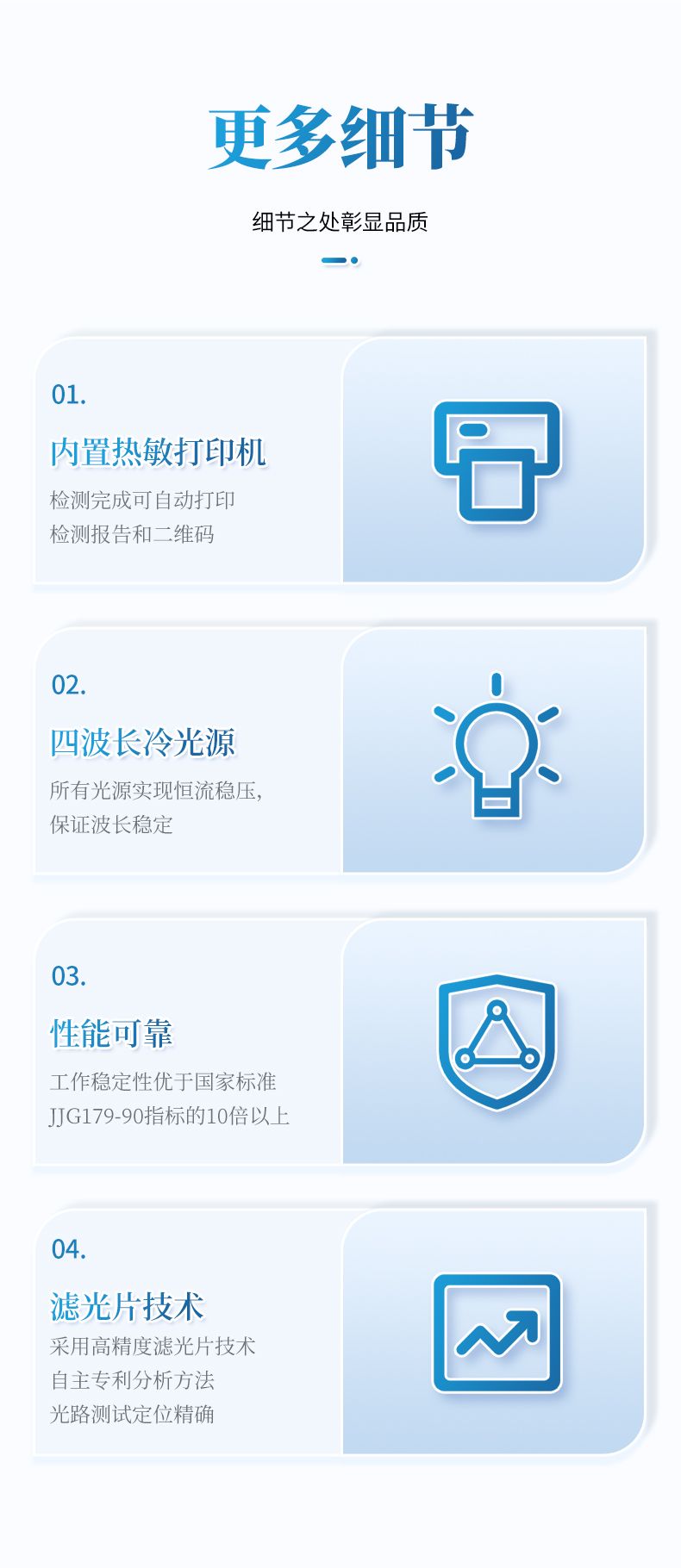 ★獨(dú)家采用高亮LED燈光源、雙撥輪濾光式處理技術(shù),保證光源波長(zhǎng)穩(wěn)定, 硅半導(dǎo)體作為信號(hào)接收系統(tǒng), 壽命長(zhǎng)達(dá)10萬(wàn)小時(shí)級(jí)別。光源穩(wěn)定,重現(xiàn)性好,準(zhǔn)確度高。