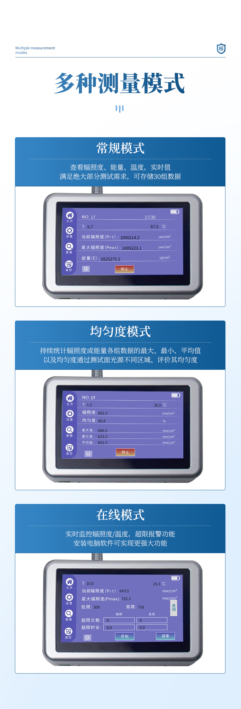 取,精度更高;量程可自動識別切換,真正實現從弱光到強光一機式測試,儀器操作更加簡單快捷。快速、準確地測量出不同光源強度下的光固化、光刻、光照治療、殺菌消毒、理療熒光分析、植物栽培、水處理、氣象和農業生產紫外線光源等各行業的紫外線輻照度。