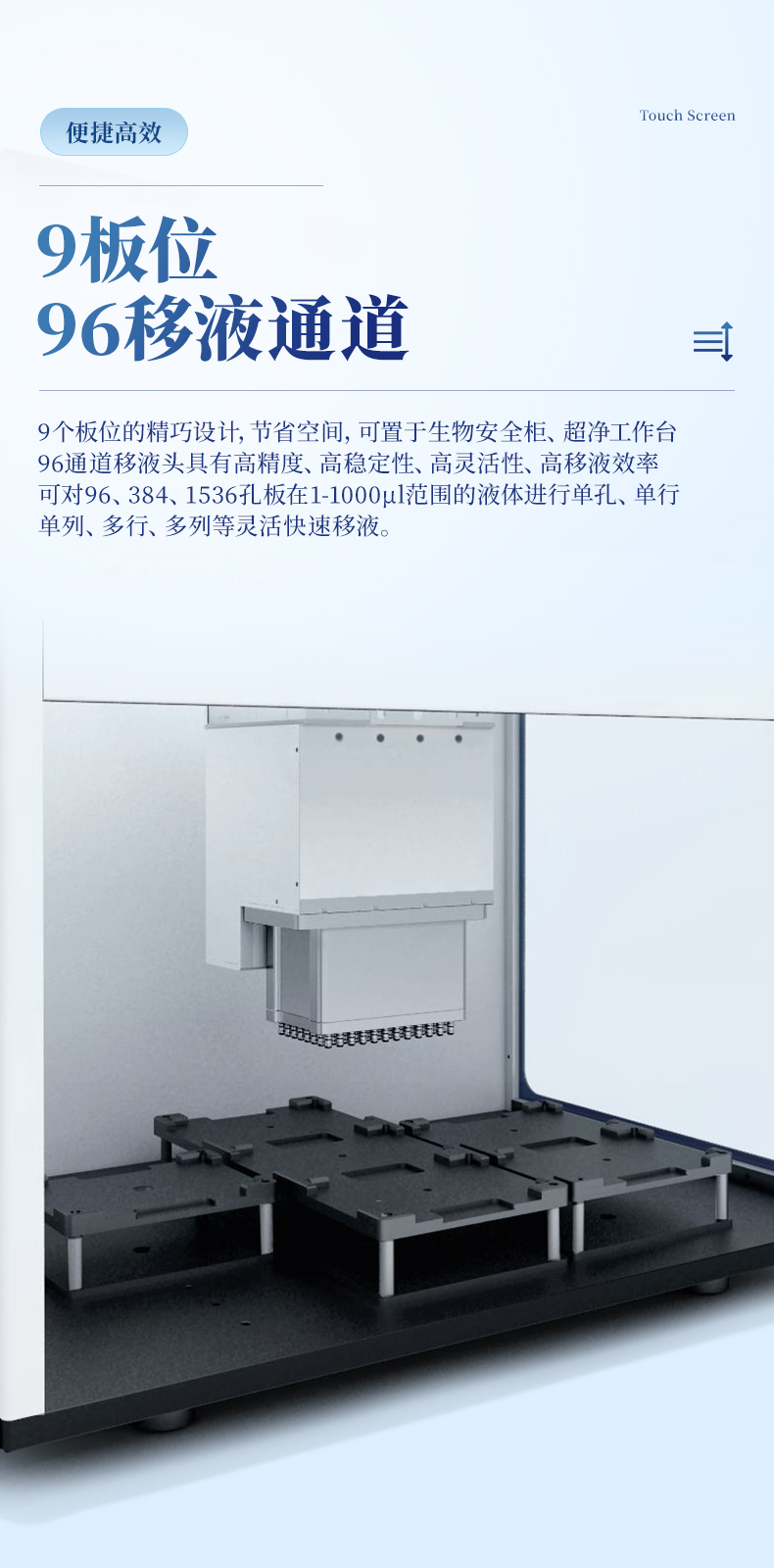 移液高效精準:采用優化的空氣置換密封技術,96通道移液頭高效移液;可兼顧不同量程;能夠從96或384孔板精準移液。
