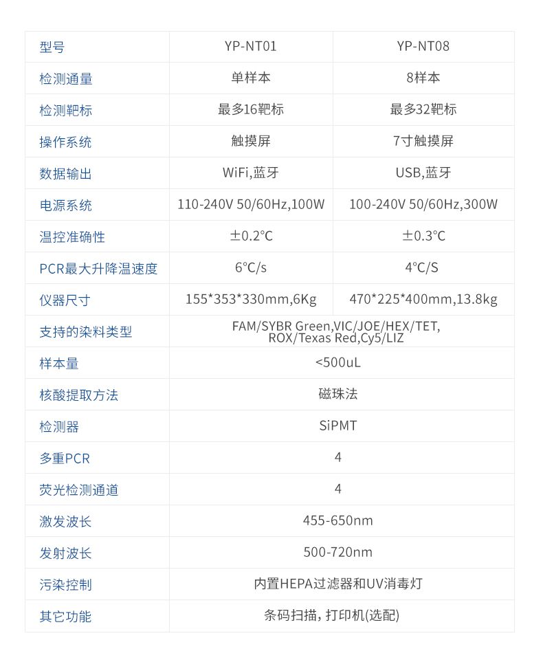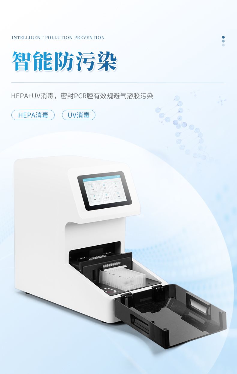 全自動核酸擴增快檢設備,集核酸提取、PCR擴增以及熒光檢測于一體,在密閉的環 境中進行核酸的提取及擴增。操作簡單,一次實驗 支持一人份最多16靶標的檢測。基于磁珠法的核提方式,兼容多種試劑體系。速度快,體積小,無需轉管,小體量即可實現樣本進、結果出的全實驗流 程。應用場景廣泛,需要多樣本檢測時可以并行多 臺設備,使用靈活方便。