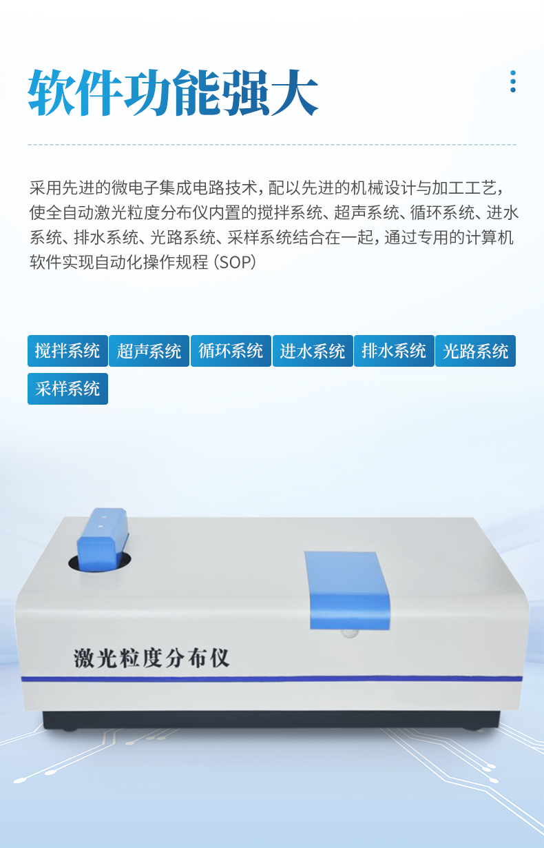 激光粒度分布儀系統是集光、機、電、計算機為一體的高科技產品,數據處理有專用的計算機分析系統軟件完成,同時由打印機完成測試報告的輸出。
