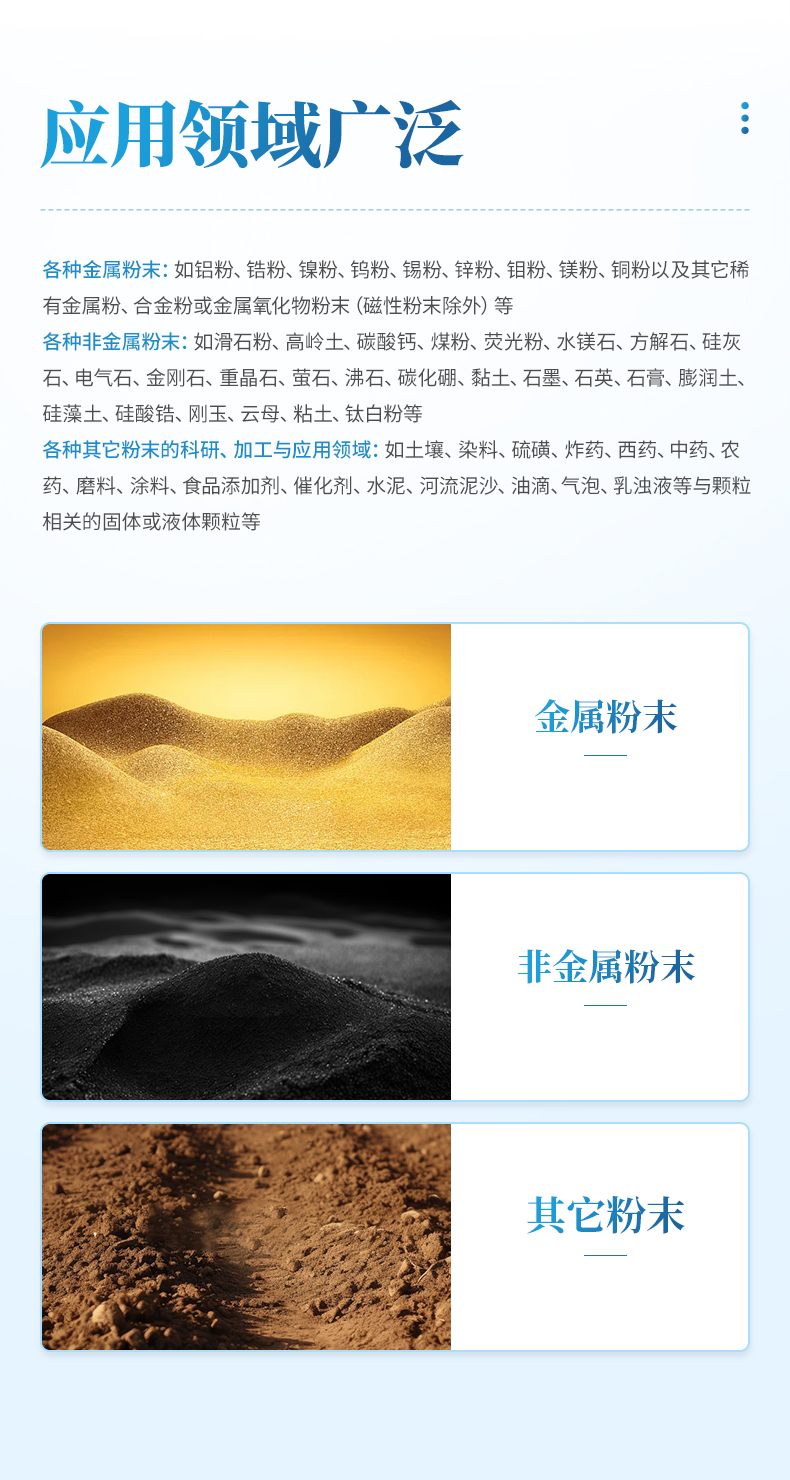 各種其它粉末的科研、加工與應(yīng)用領(lǐng)域:如土壤、染料、硫磺、炸藥、西藥、中藥、農(nóng)藥、磨料、涂料、食品添加劑、催化劑、水泥、河流泥沙、油滴、氣泡、乳濁液等與顆粒相關(guān)的固體或液體顆粒等。