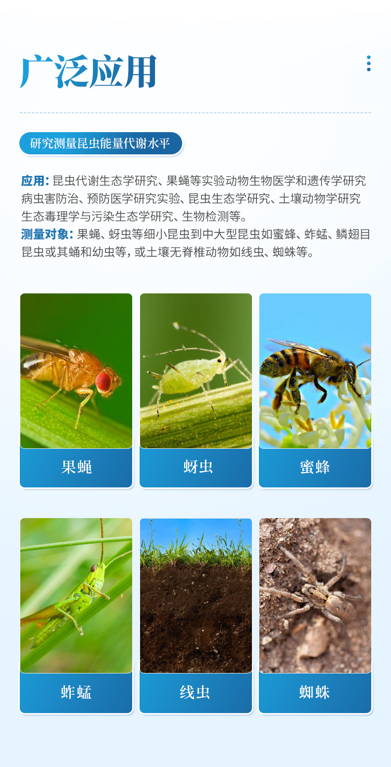 測量對象:果蠅、蚜蟲等細(xì)小昆蟲到中大型昆蟲如蜜蜂、蚱蜢、鱗翅目昆蟲或其蛹和幼蟲等,或土壤無脊椎動物如線蟲、蜘蛛等。