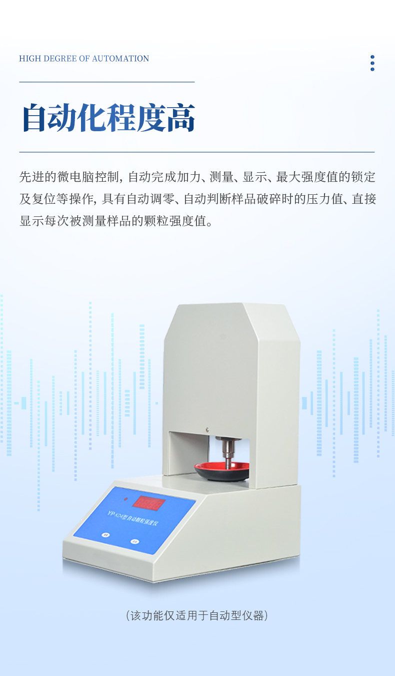 儀器采用先進的微電腦控制,自動完成加力、測量、顯示、最大強度值的鎖定及復位等操作,具有自動調零、自動判斷樣品破碎時的壓力值、直接顯示每次被測量樣品的顆粒強度值。是催化劑、化肥、藥品、水果等顆粒樣品聚合強度測定最理想的新型試驗儀器。