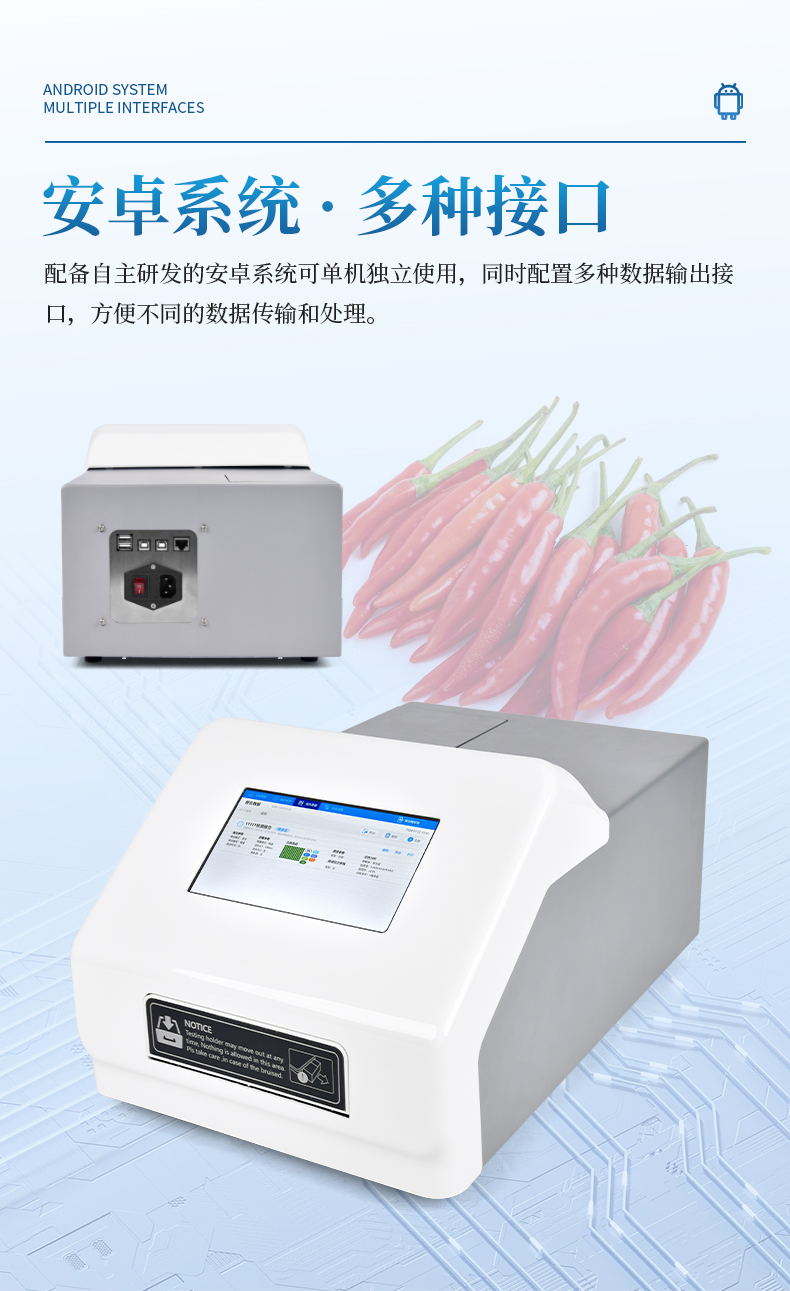 辣椒素檢測儀主要用于各種辣椒及辣椒制品中的天然辣椒素、辣度檢測。儀器由亮度發(fā)光二管光源、比色池、高靈敏度集成光電池、微處理器、漢字大屏幕液晶屏、嵌入式微型熱敏打印機集成芯片構(gòu)成,可直接在大屏幕液晶屏上顯示出被測樣品中相關(guān)指標(biāo)的含量,并打印出分析結(jié)果,還可以通過計算機接口將數(shù)據(jù)傳輸?shù)诫娔X進行數(shù)據(jù)分析。