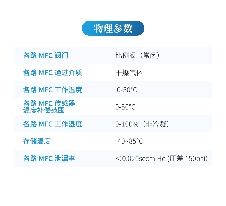 各路 MFC 零點漂移和滿量程漂移 <±0.02% FS/℃/Atm