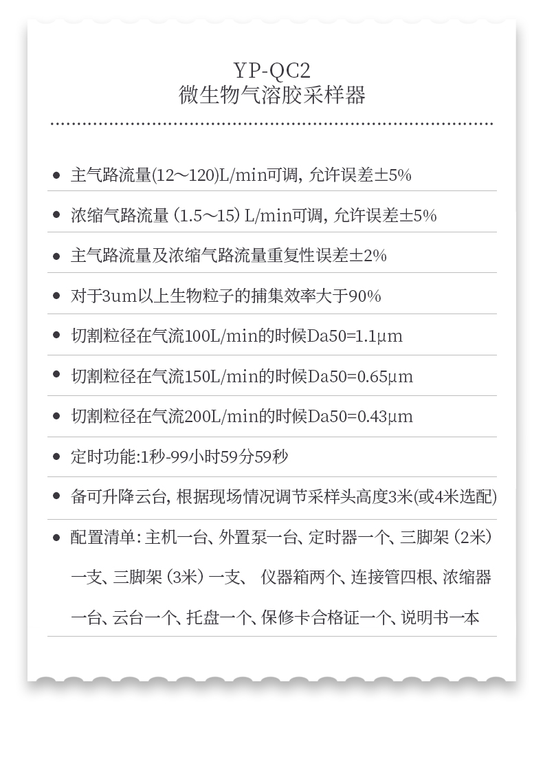本產(chǎn)品符合標(biāo)準(zhǔn)《GB/T 18204.5-2013 公共場(chǎng)所衛(wèi)生檢驗(yàn)方法 第5部分:集中空調(diào)通風(fēng)系統(tǒng)》和衛(wèi)生行業(yè)標(biāo)準(zhǔn)《WS 394-2012 公共場(chǎng)所集中空調(diào)通風(fēng)系統(tǒng)衛(wèi)生規(guī)范》要求,采集集中空調(diào)送風(fēng),檢測(cè)其中的嗜肺軍團(tuán)菌。采集流量大,使需要的粒子短時(shí)間濃縮到采樣器中,避免長(zhǎng)時(shí)間采樣帶來(lái)的生物活性損失,提高采樣器的現(xiàn)場(chǎng)實(shí)用性。