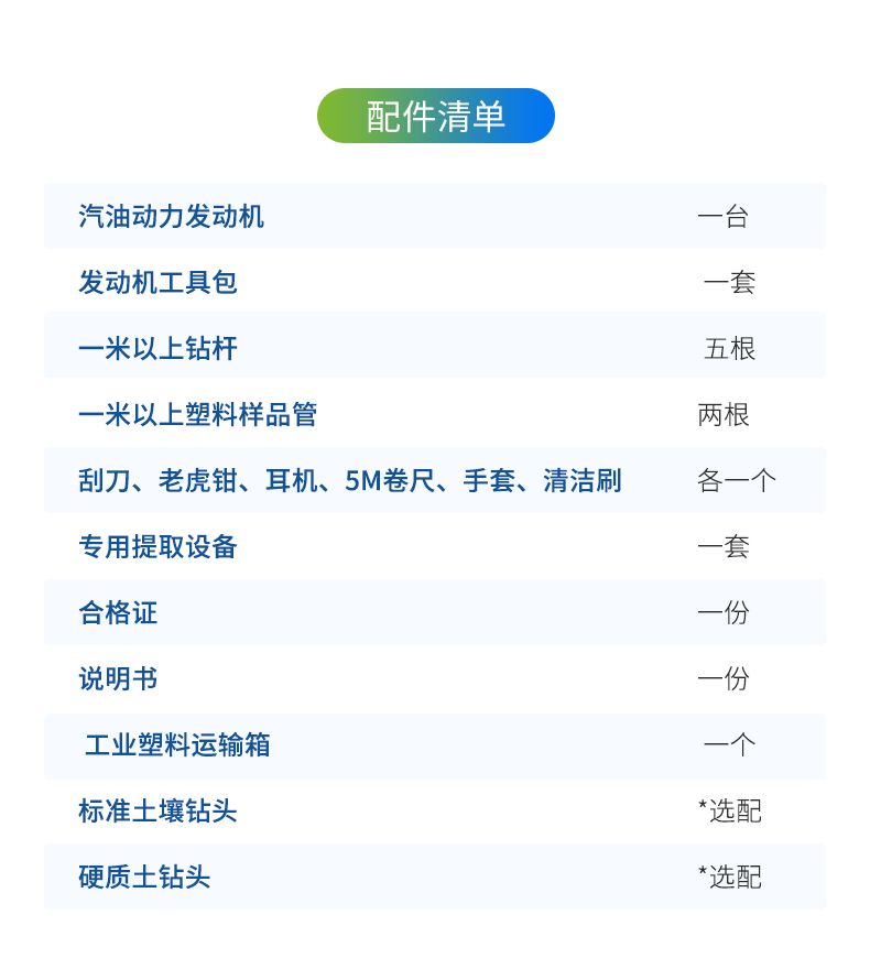 汽油動(dòng)力發(fā)動(dòng)機(jī)一臺(tái),發(fā)動(dòng)機(jī)工具包一套,標(biāo)準(zhǔn)土壤鉆頭、硬質(zhì)土鉆頭隨意選配,不小于1米的鉆桿5根、不小于1米的塑料樣品管2根,刮刀、老虎鉗、耳機(jī)、5M卷尺、手套、清潔刷各1個(gè),專用提取設(shè)備1套、工業(yè)塑料運(yùn)輸箱1個(gè)