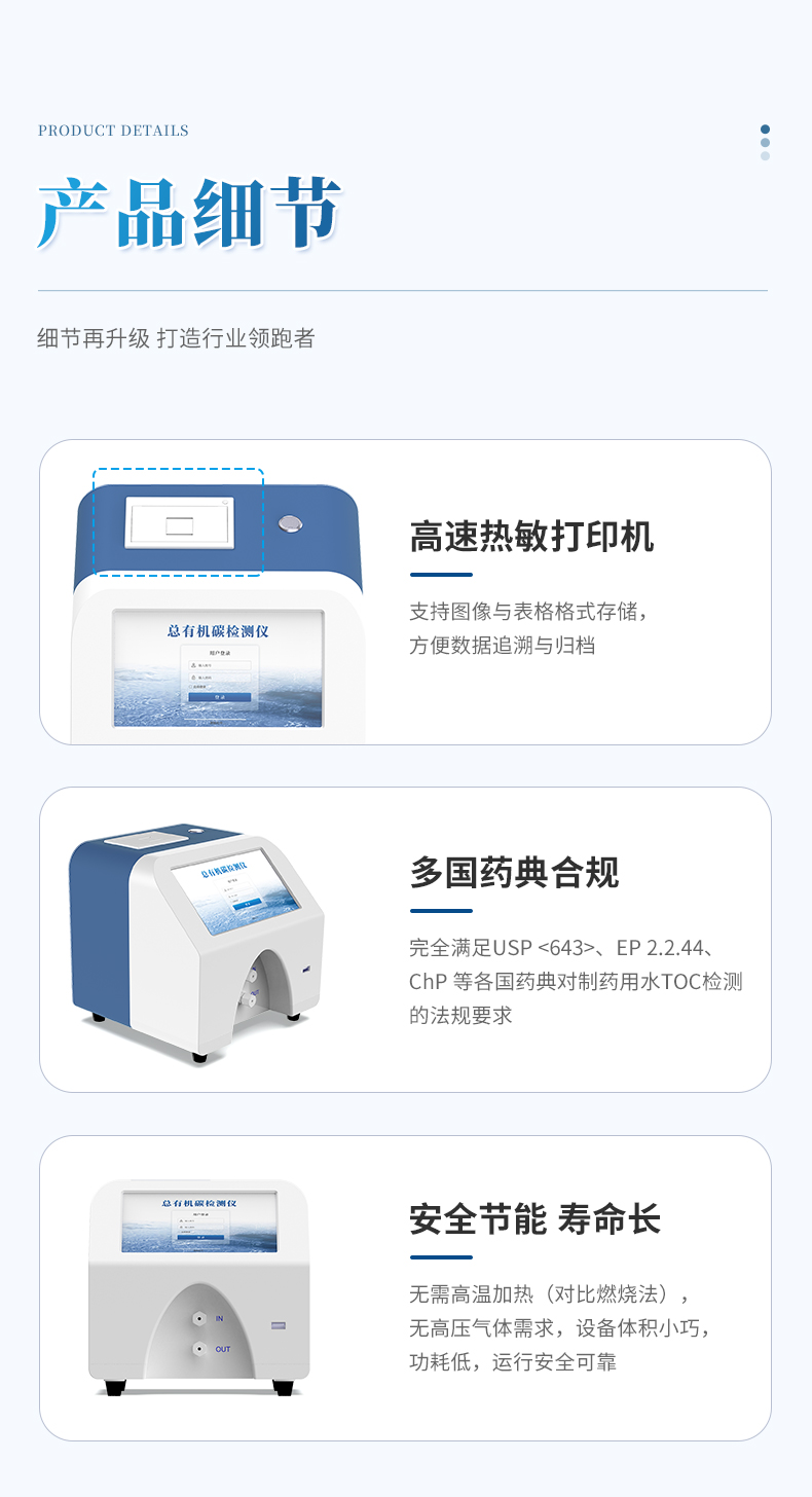 (3)合規性保障:完全滿足USP <643>、EP 2.2.44、ChP 等各國藥典對制藥用水TOC檢測的法規要求。