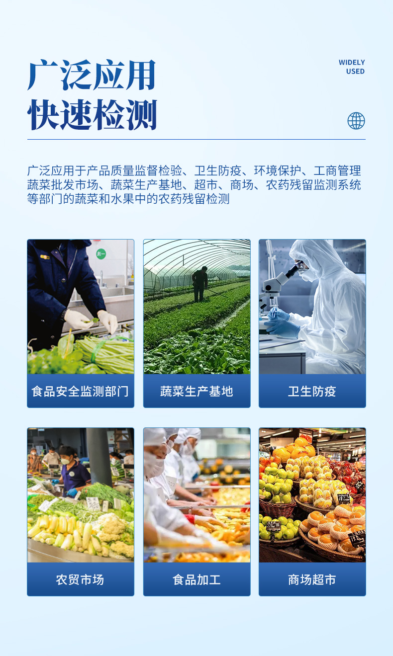 它可以廣泛應(yīng)用于產(chǎn)品質(zhì)量監(jiān)督檢驗(yàn)、衛(wèi)生防疫、環(huán)境保護(hù)、工商管理、蔬菜批發(fā)市場(chǎng)、蔬菜生產(chǎn)基地、超市、商場(chǎng)、農(nóng)藥殘留監(jiān)測(cè)系統(tǒng)等部門(mén)的蔬菜和水果中的農(nóng)藥殘留檢測(cè)。