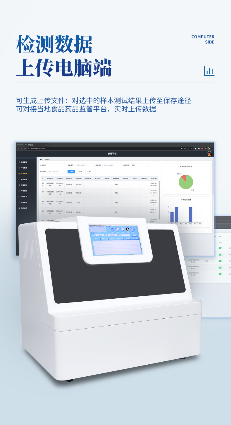 軟件:可生成上傳文件:對(duì)選中的樣本測(cè)試結(jié)果上傳至保存途徑。可對(duì)接當(dāng)?shù)厥称匪幤繁O(jiān)管平臺(tái),實(shí)時(shí)上傳數(shù)據(jù)。
