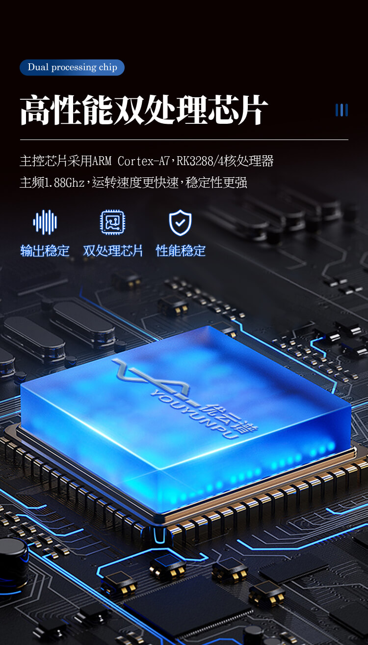 1、主控芯片采用ARM Cortex-A7,RK3288/4核處理器,主頻1.88Ghz,運轉速度更快速,穩定性更強。