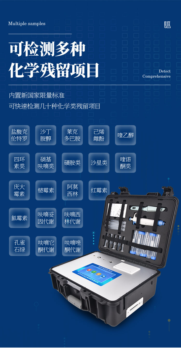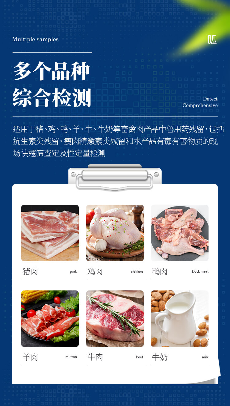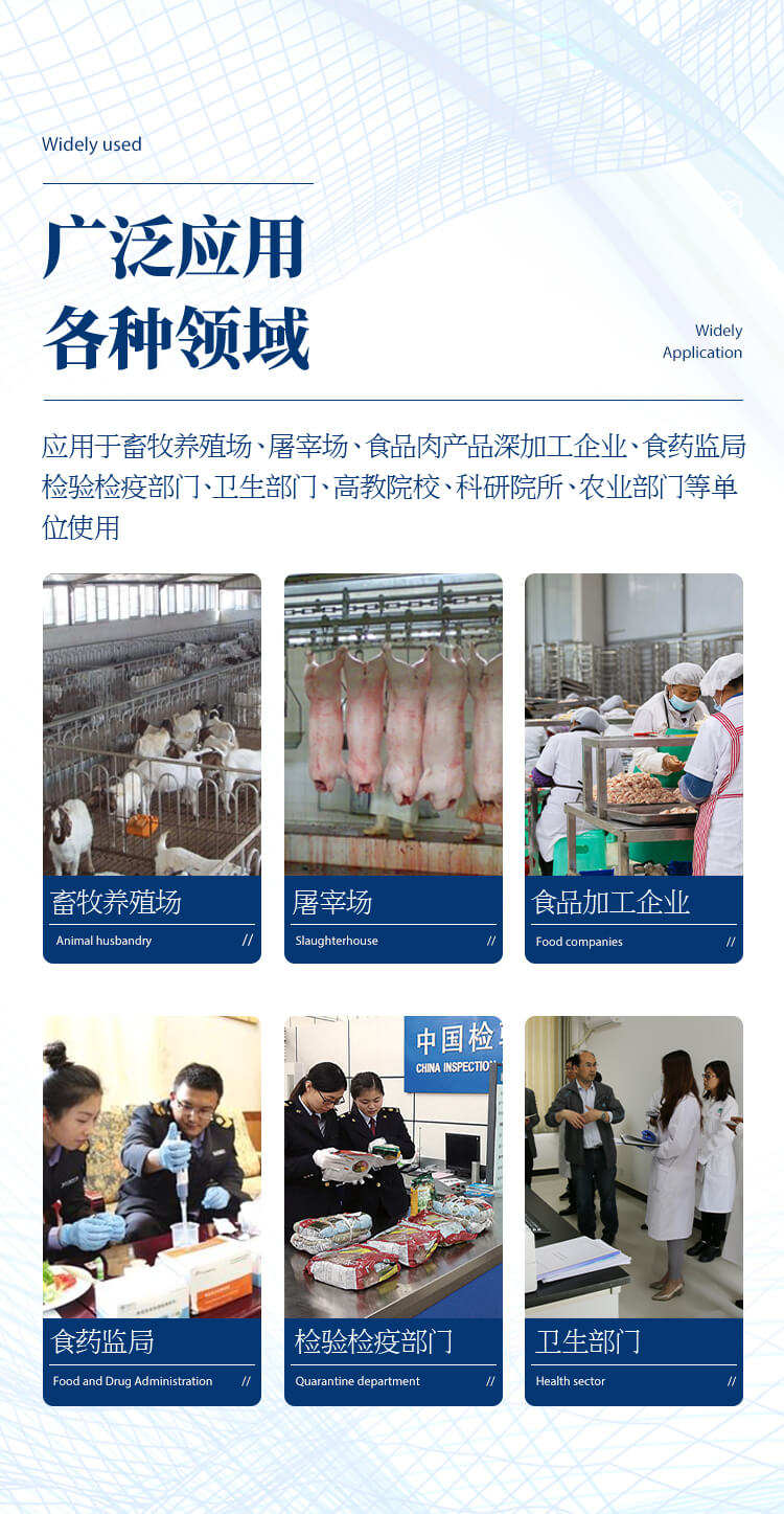 該獸藥殘留檢測儀適用于豬、雞、鴨、羊、牛、牛奶等畜禽肉產品中獸藥殘留,包括抗生素類殘留、瘦肉精激素類殘留和水產品有毒有害物質的現場快速篩查定及性定量檢測。