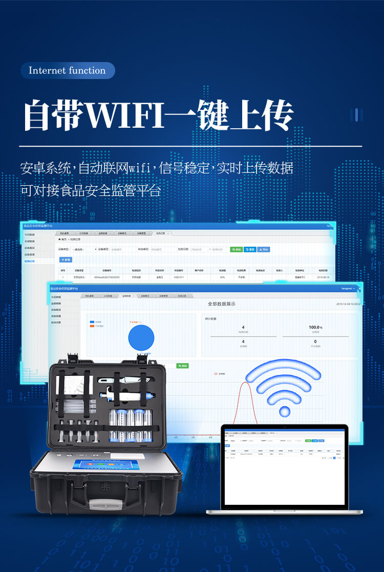 ★4、儀器帶有監管平臺,數據可局域網和互聯網數據上傳,檢測結果直接傳至食品安全監管平臺。進行區域食品安全監管及大數據分析處理與數據統計,檢測區域食品安全長短期動態,達到食品安全問題預估、預警