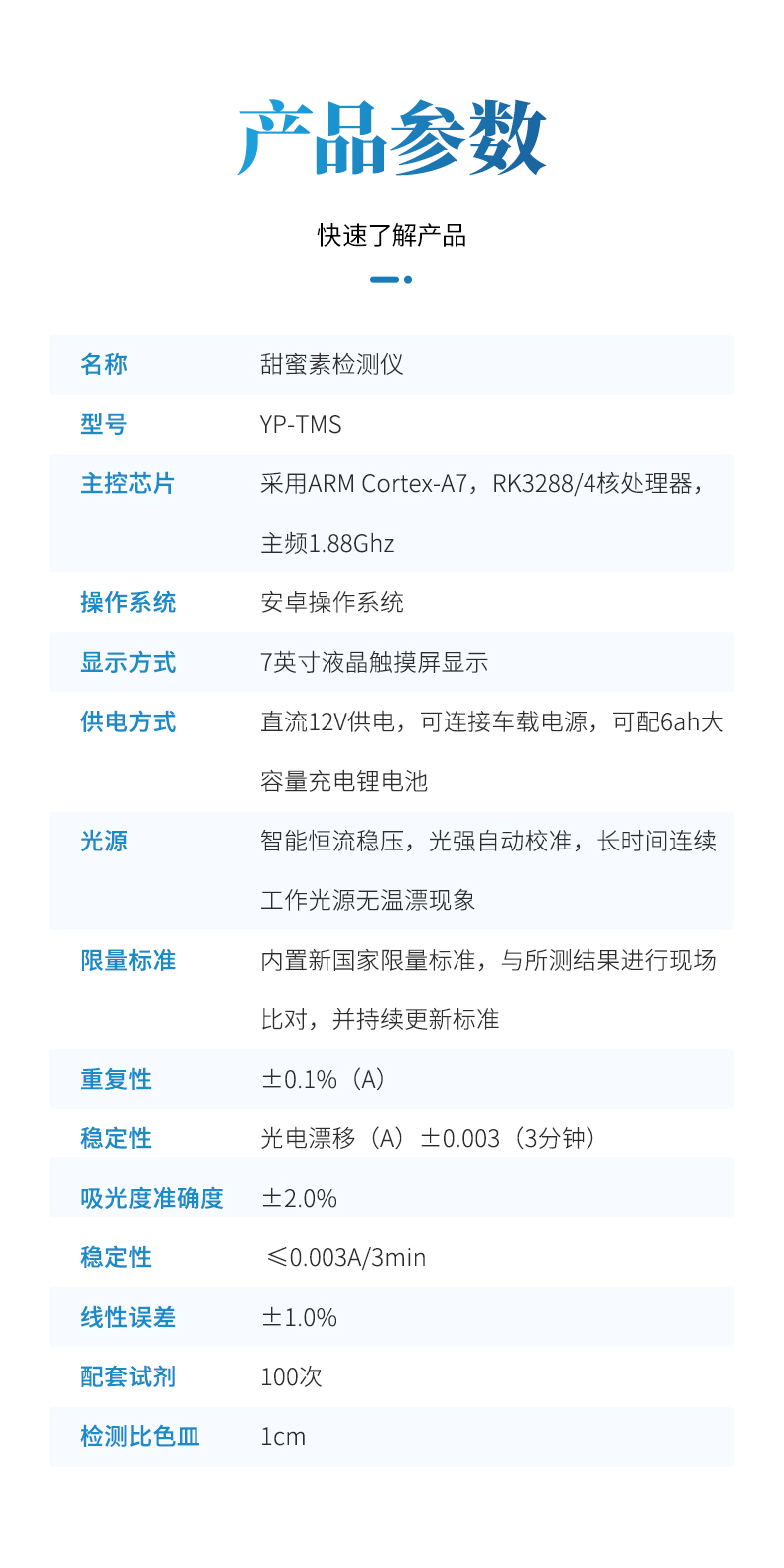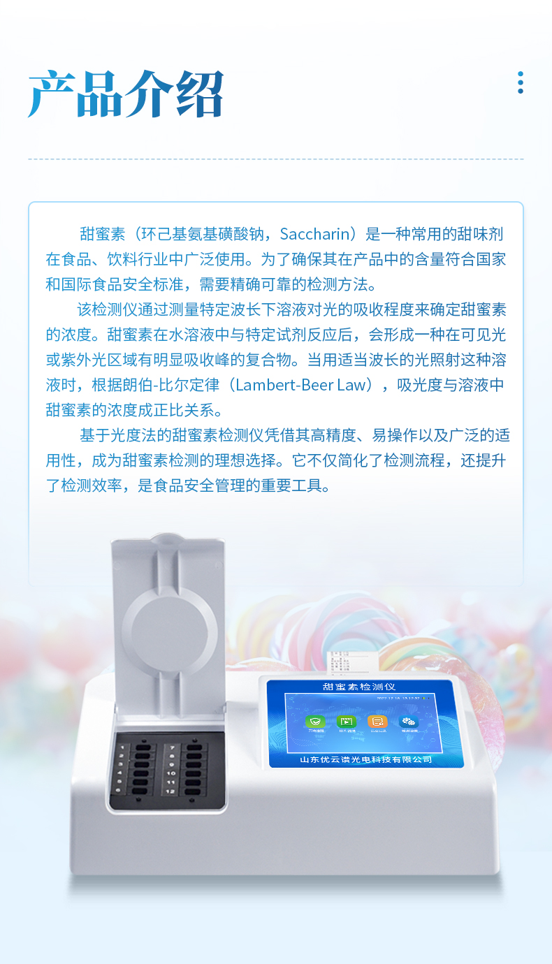 該檢測儀通過測量特定波長下溶液對光的吸收程度來確定甜蜜素的濃度。甜蜜素在水溶液中與特定試劑反應后,會形成一種在可見光或紫外光區域有明顯吸收峰的復合物。當用適當波長的光照射這種溶液時,根據朗伯-比爾定律(Lambert-Beer Law),吸光度與溶液中甜蜜素的濃度成正比關系。