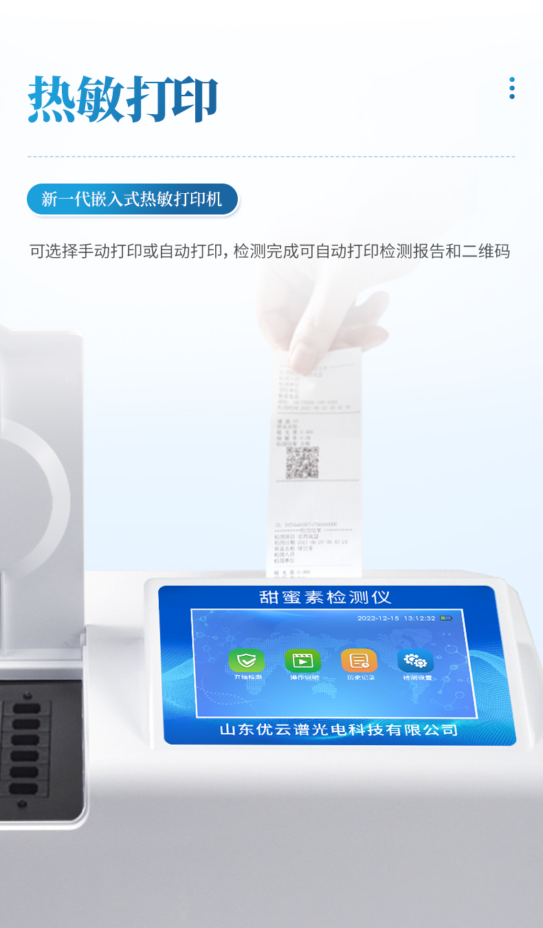 4、配備新一代嵌入式熱敏打印機,可選擇手動打印或者自動打印,檢測完成可自動打印檢測報告和二維碼。
