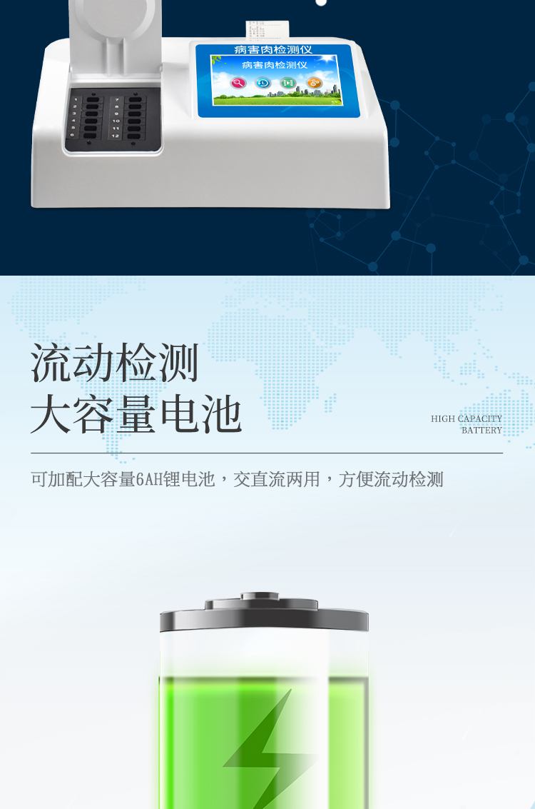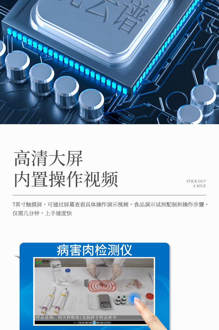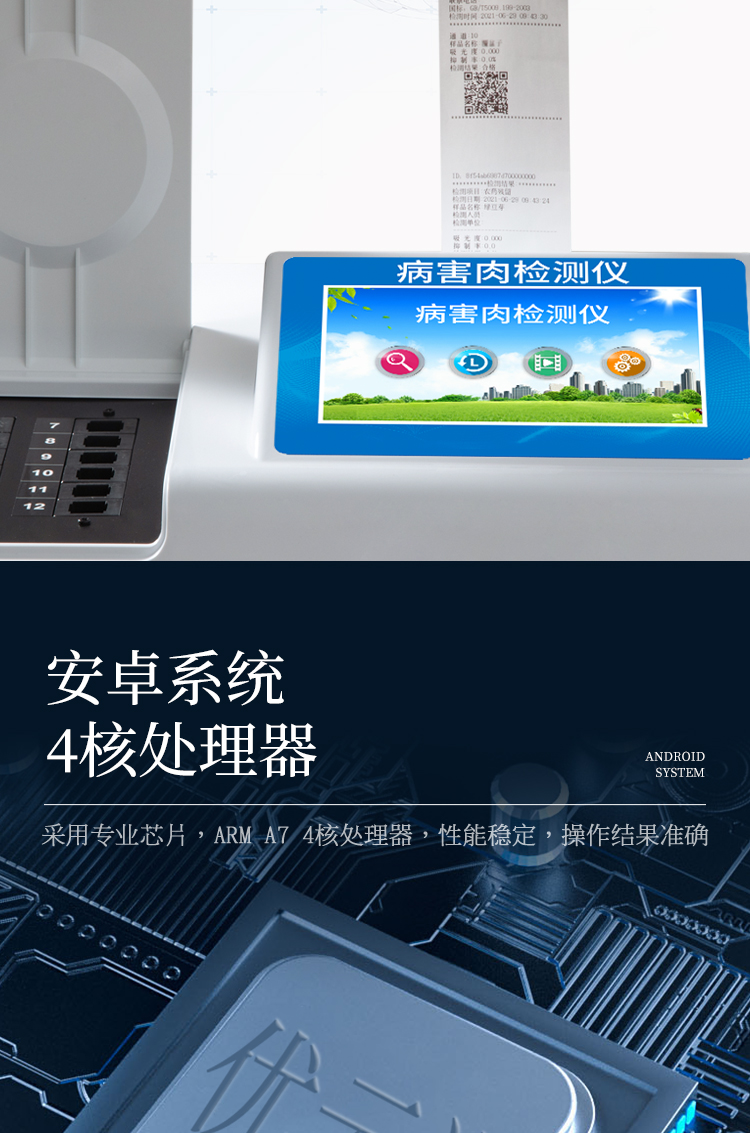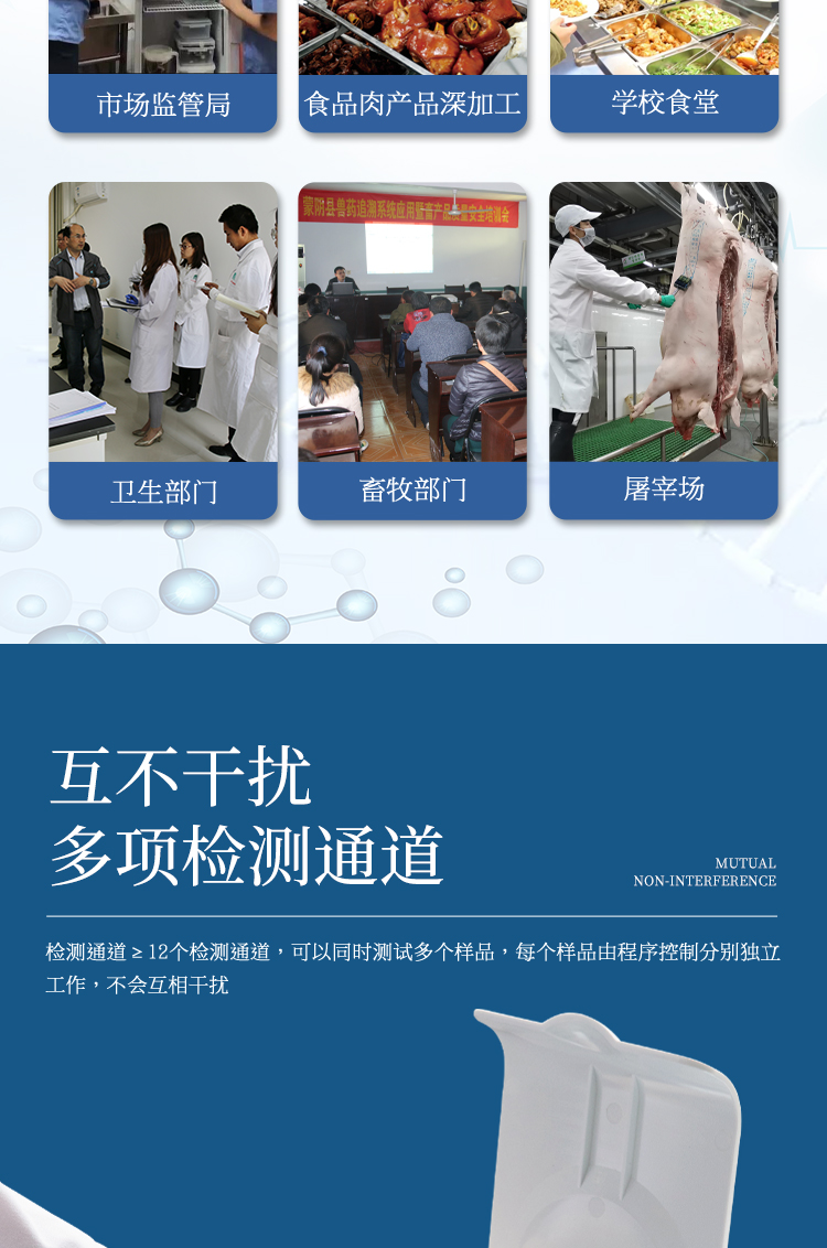 可快速檢測(cè)病害肉、組胺、揮發(fā)性鹽基氮,儀器預(yù)留其他項(xiàng)目檢測(cè)程序和端口,根據(jù)日后需求可方便的自主增加檢測(cè)項(xiàng)目。