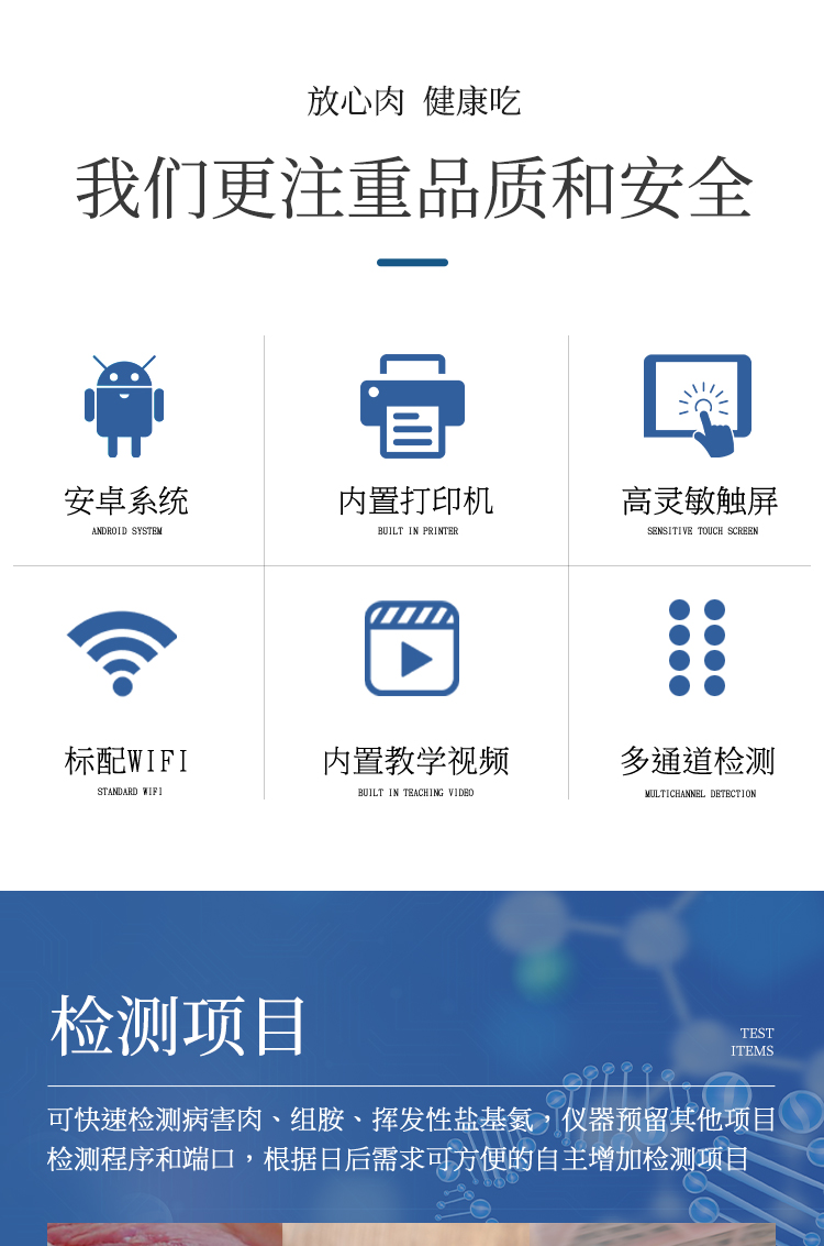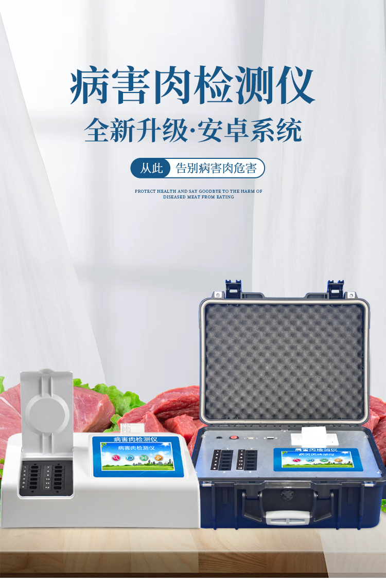 可快速檢測病害肉、組胺、揮發(fā)性鹽基氮,儀器預(yù)留其他項目檢測程序和端口,根據(jù)日后需求可方便的自主增加檢測項目。