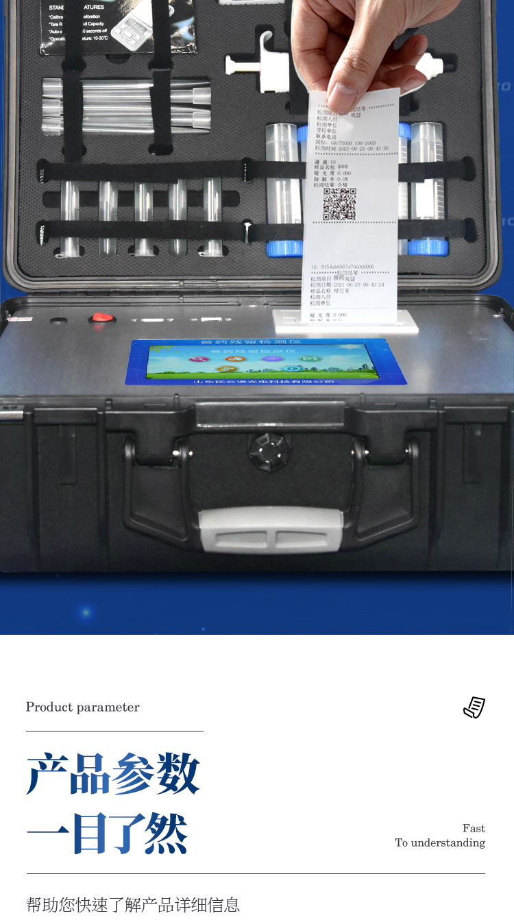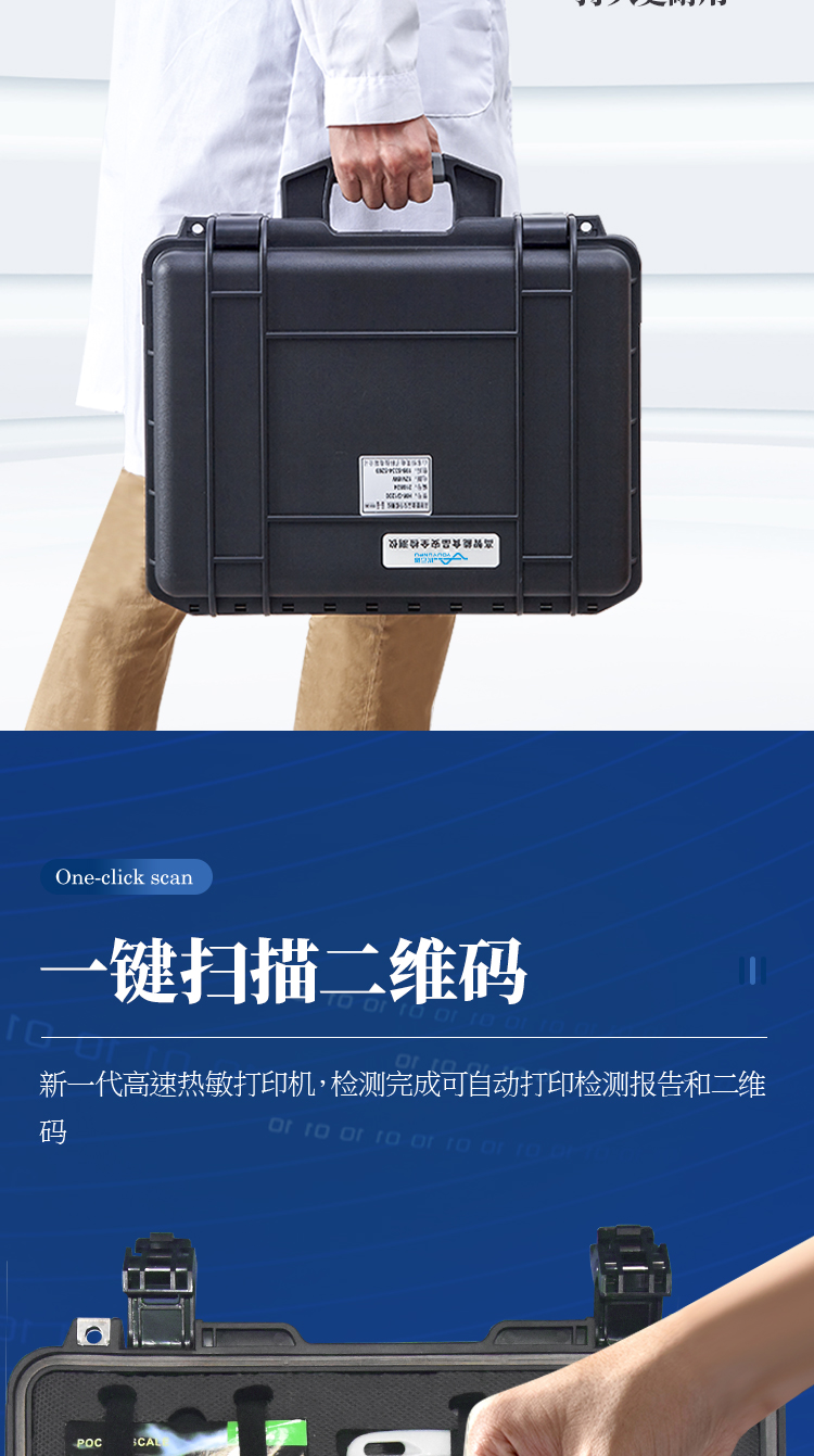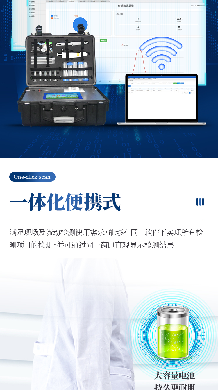 7、一體化便攜式快檢設備,滿足現場及流動檢測使用需求,能夠在同一軟件下實現所有檢測項目的檢測,并可通過同一窗口直觀顯示檢測結果。