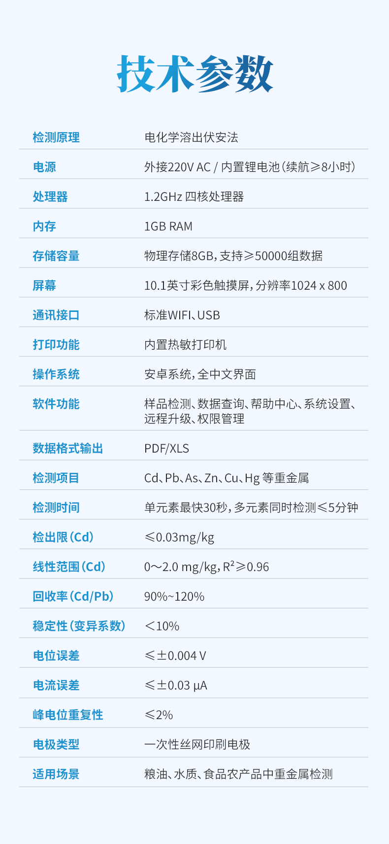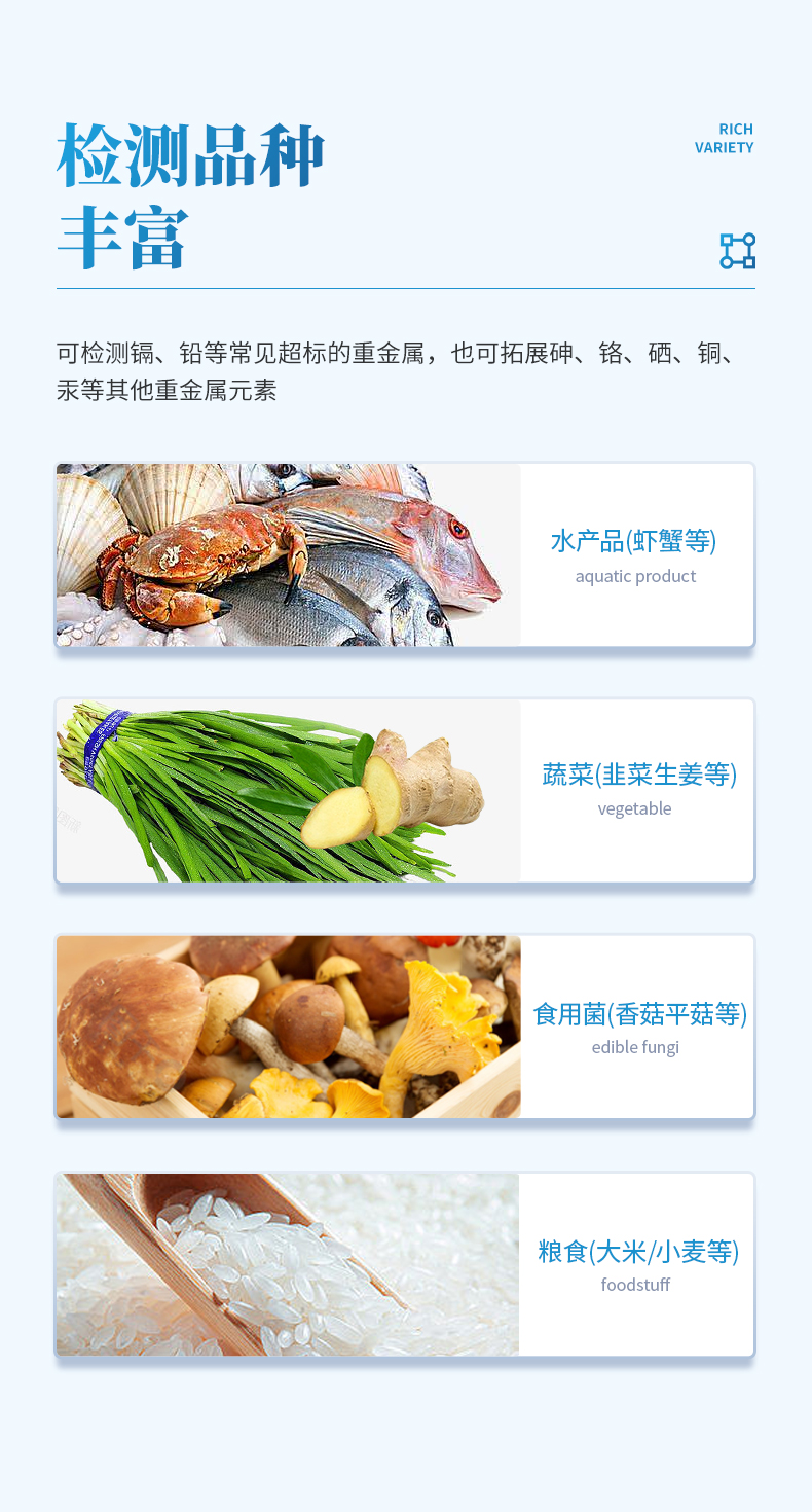 5、應(yīng)用范圍廣,同時(shí)適用于農(nóng)產(chǎn)品、水產(chǎn)品、加工食品的重金屬現(xiàn)場(chǎng)或?qū)嶒?yàn)室快速分析。
