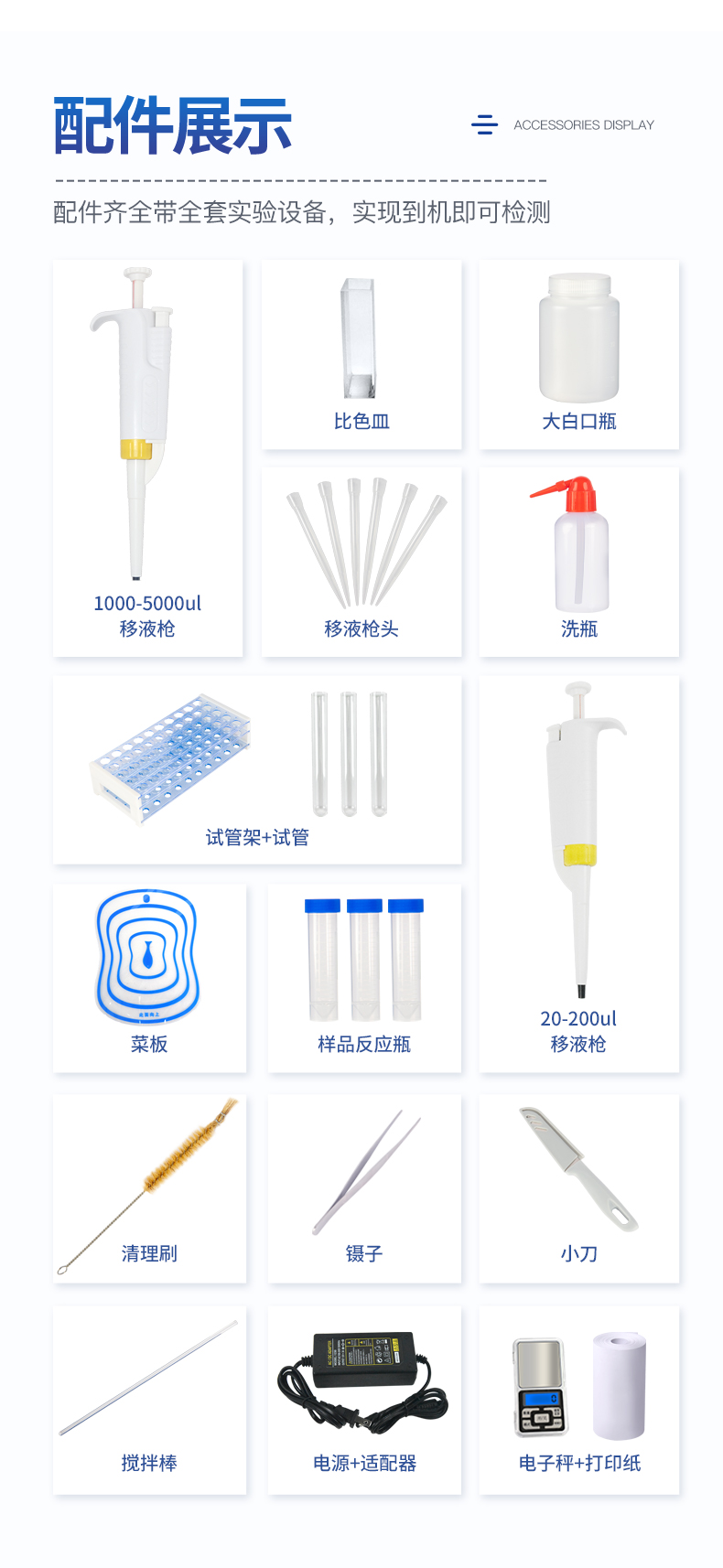 1、 檢測項目:用于快速檢測食品中吊白塊,儀器預(yù)留其他項目檢測程序和端口,根據(jù)日后需求可方便的自主增加檢測項目。日后可升級為檢測,水產(chǎn)品,肉制品,面制品的綜合類型儀器。