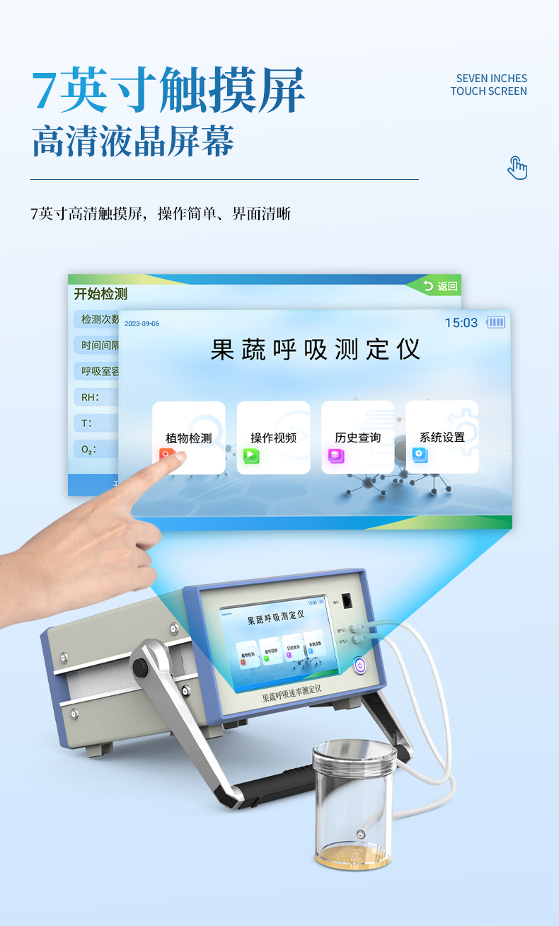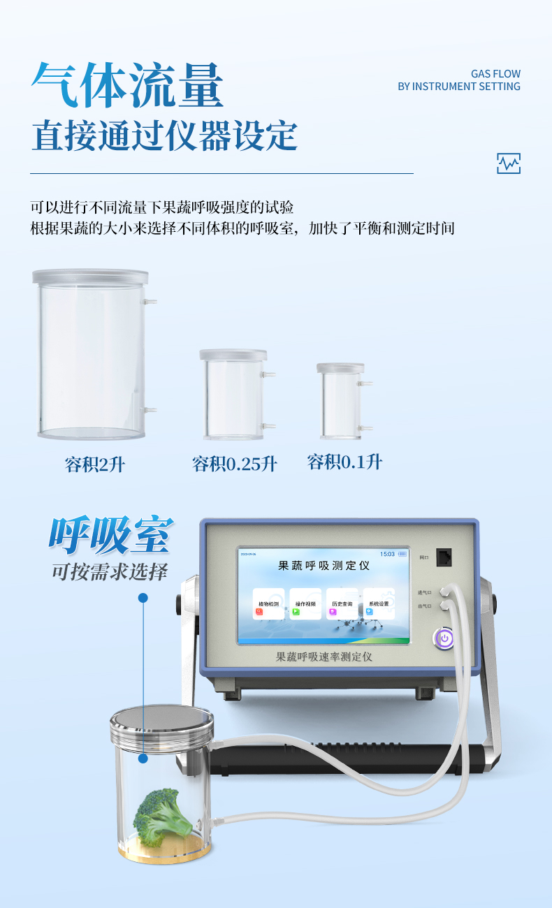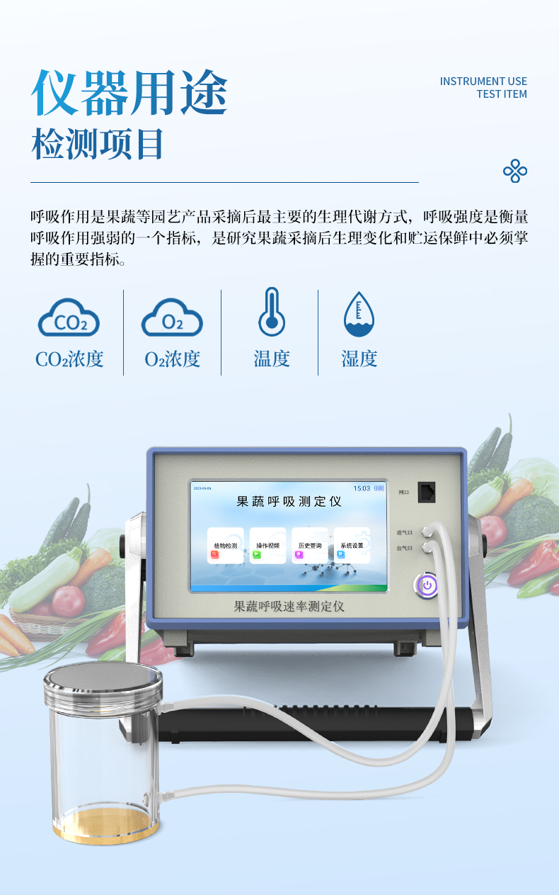 該儀器的特點(diǎn)是可以根據(jù)果蔬的大小來選擇不同體積的呼吸室,加快了平衡和測(cè)定時(shí)間;可以直接操顯示呼吸室的CO2濃度、O2濃度、溫度和濕度及變化曲線。