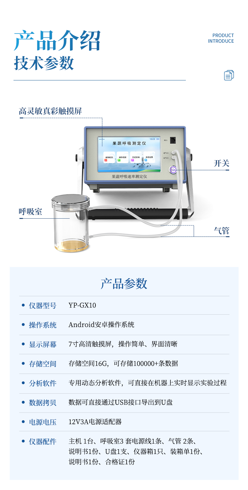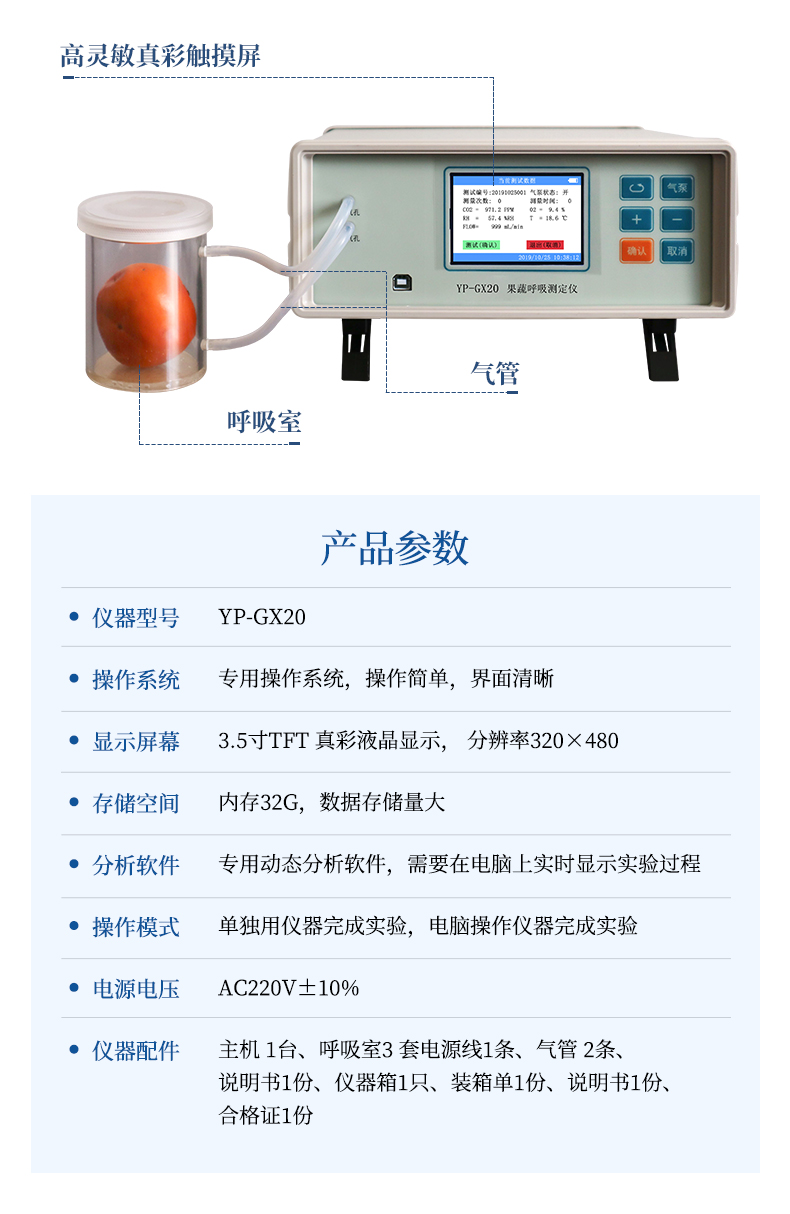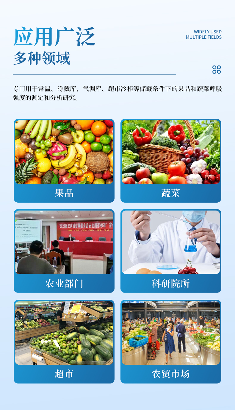 該儀器的特點(diǎn)是可以根據(jù)果蔬的大小來選擇不同體積的呼吸室,加快了平衡和測(cè)定時(shí)間;可以直接操顯示呼吸室的CO2濃度、O2濃度、溫度和濕度及變化曲線。