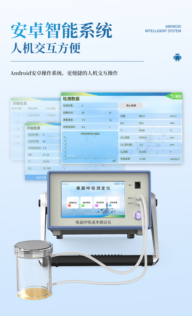 果蔬呼吸儀采用雙波長(zhǎng)紅外二氧化碳分析器,7寸安卓顯示器,專門用于常溫、冷藏庫、氣調(diào)庫、超市冷柜等儲(chǔ)藏條件下的果品和蔬菜呼吸強(qiáng)度的測(cè)定和分析研究。