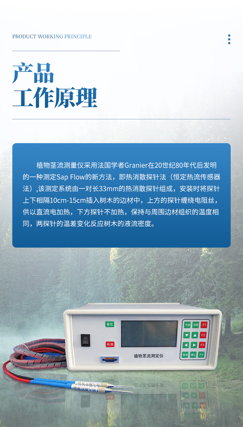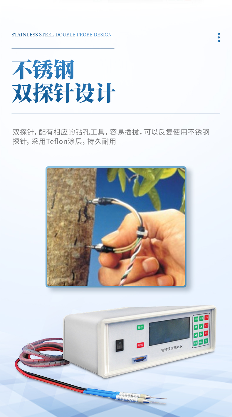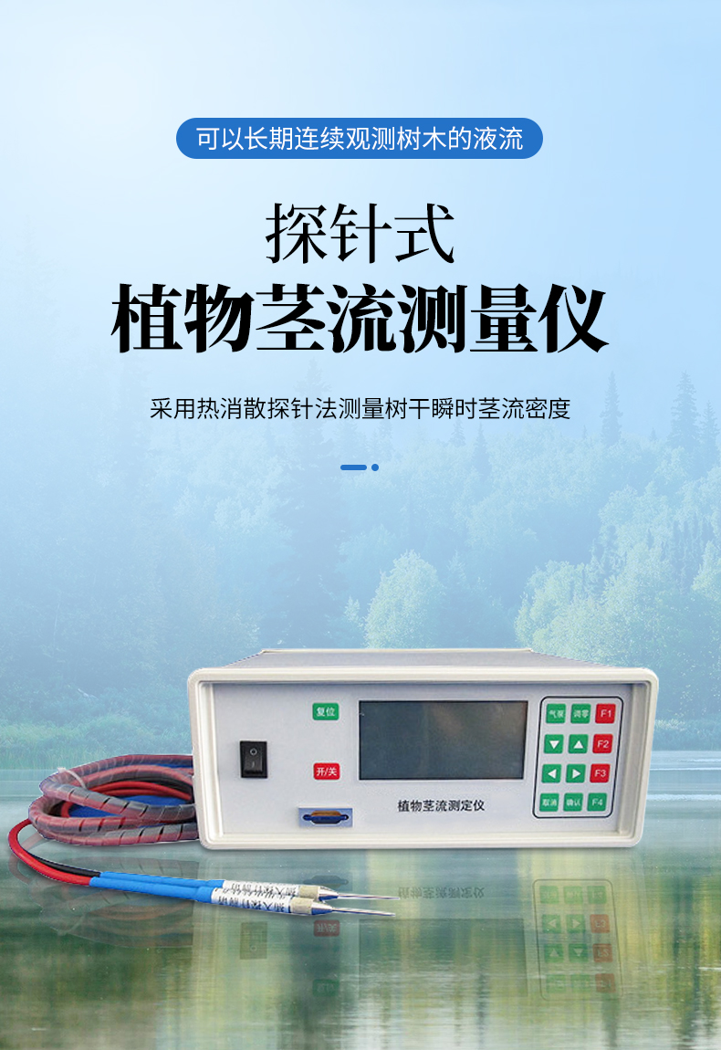 植物莖流測量儀采用法國學者Granier在20世紀80年代后發(fā)明的一種測定Sap Flow的新方法,即熱消散探針法(恒定熱流傳感器法)。該方法的數據采集具有準確穩(wěn)定的特點,而且可以連續(xù)不間斷的讀取數據,因而數據具有系統(tǒng)性。該測 定系統(tǒng)由一對長33mm的熱消散探針組成,安裝時將探針上下相隔10cm-15cm插入樹木的邊材中,上方的探針纏繞電阻絲,供以直流電加熱,下方探針不 加熱,保持與周圍邊材組織的溫度相同,兩探針的溫差變化反應樹木的液流密度。