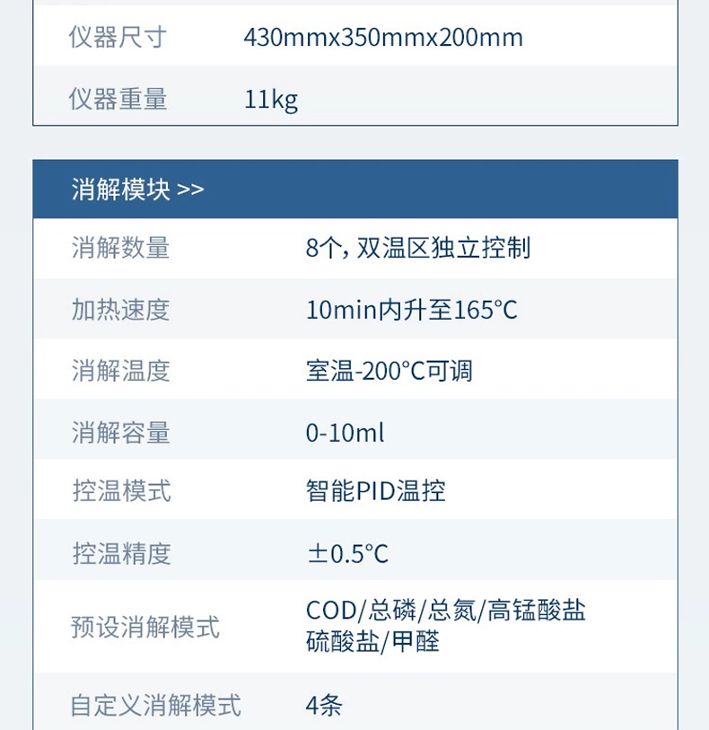 預(yù)設(shè)消解模式:COD、總磷、總氮、高錳酸鹽、硫酸鹽、甲醛;