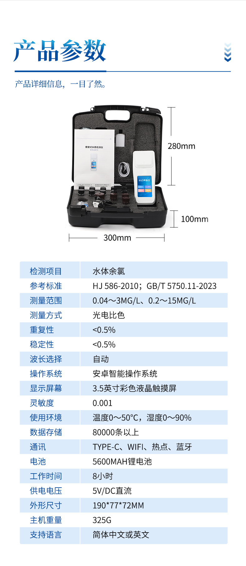 便攜式余氯總氯檢測儀參考HJ 586-2010和GB/T 5750.11-2023標準制造;配合快速顯色檢測試劑,可“快速、簡單、準確、穩定”進行測量,擁有精美的外觀造型,簡單的操作界面,準確的檢測系統,幫助用戶獲得精細的數據,可更準確、有效的分析水體狀況。