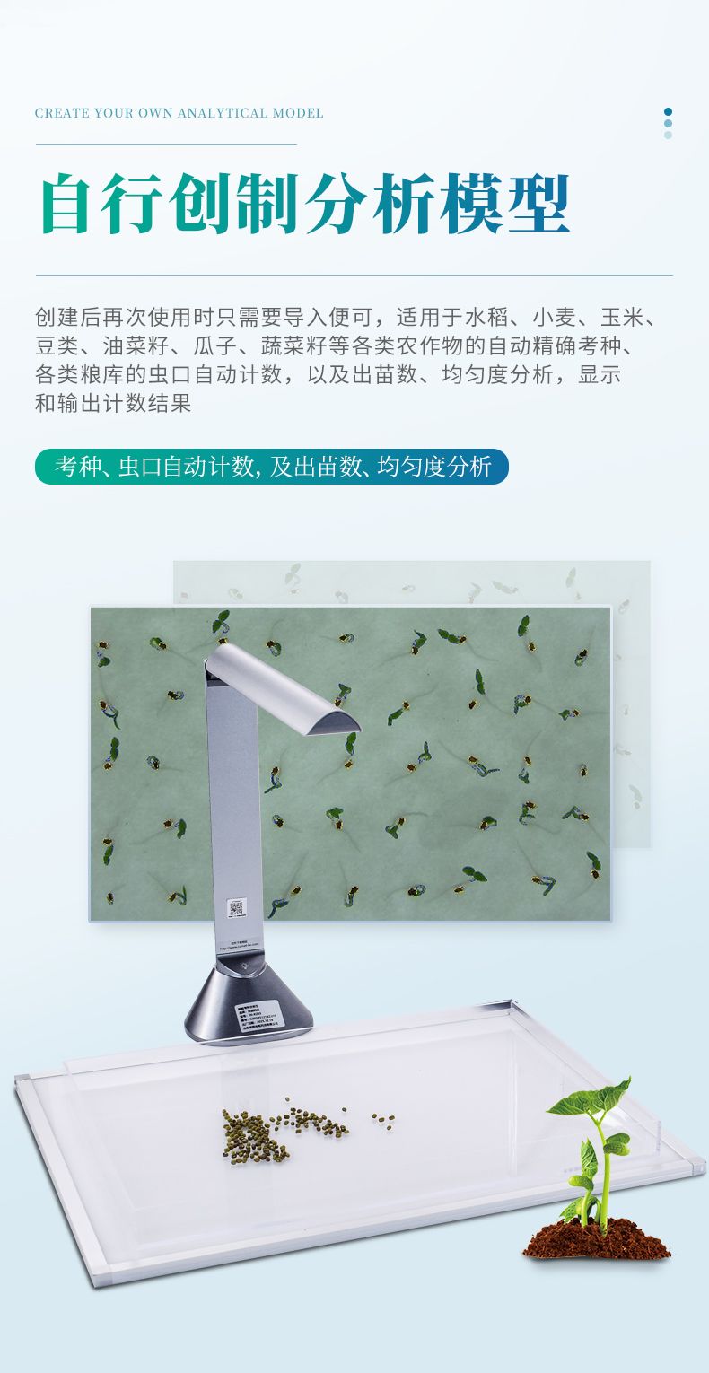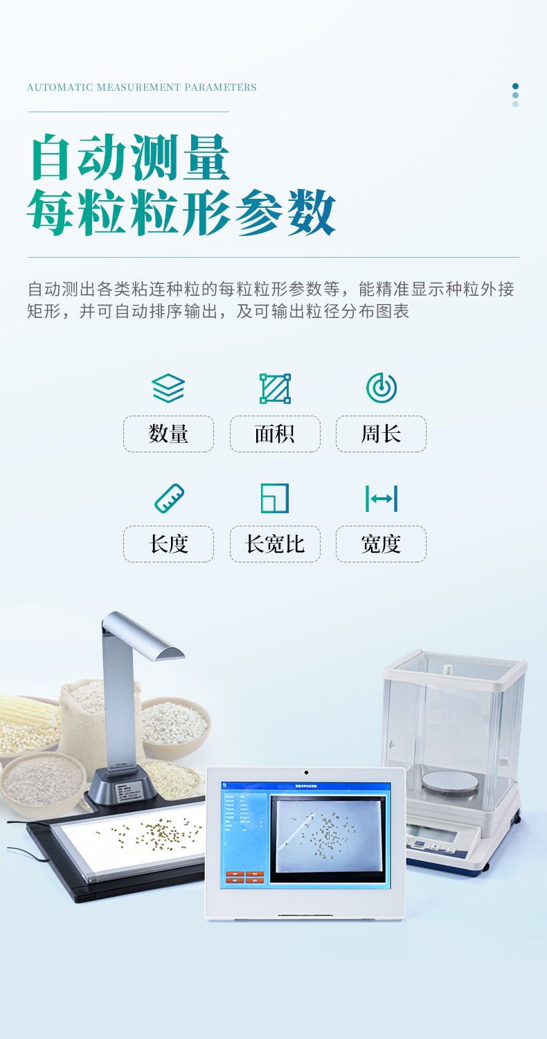智能考種系統(tǒng)由三部分組成:1600萬高拍儀、背光裝置和裝有嵌入式軟件的平板。背光裝置采用的是高亮LED燈,外邊框使用鋁合金材質(zhì)制成。軟件采用先進(jìn)的圖像處理技術(shù),根據(jù)距離變換原理、形態(tài)學(xué)、凸包檢測(cè)等技術(shù)綜合設(shè)計(jì)的一款嵌入式軟件。該設(shè)備主要應(yīng)用在農(nóng)業(yè)領(lǐng)域的田間作物測(cè)產(chǎn)及考種等方面,通過高拍儀拍攝的照片,軟件自動(dòng)計(jì)算種子數(shù)量,種子的面積、周長(zhǎng)、長(zhǎng)度、寬度、長(zhǎng)寬比等數(shù)據(jù),根據(jù)天平所得的重量與種子的數(shù)量自動(dòng)計(jì)算出千粒重;以列表和圖形的方式輸出結(jié)果,便于用戶查看與分析研究。本產(chǎn)品也可以手動(dòng)對(duì)作物種子數(shù)量修正以確保計(jì)數(shù)精度、對(duì)數(shù)據(jù)進(jìn)行保存,并且可以查看數(shù)據(jù)報(bào)表,最后可以將數(shù)據(jù)以Excel格式導(dǎo)出,或者通過WiFi數(shù)據(jù)上傳到儀器云數(shù)據(jù)管理系統(tǒng)從而實(shí)現(xiàn)數(shù)據(jù)統(tǒng)計(jì),分析智能化。