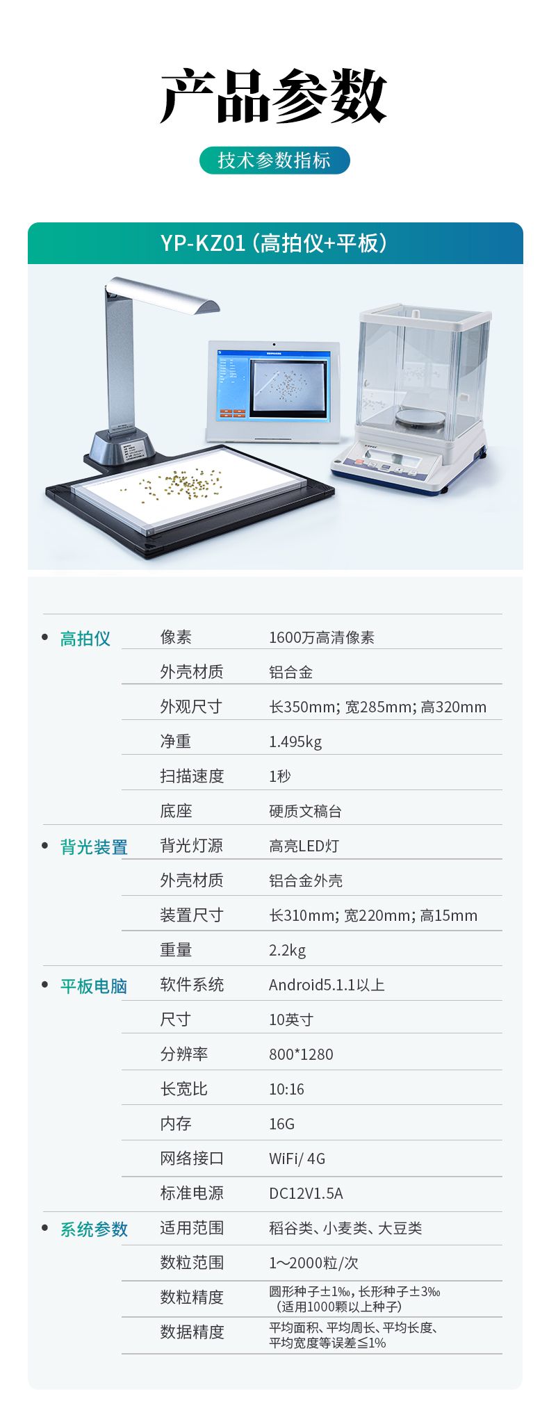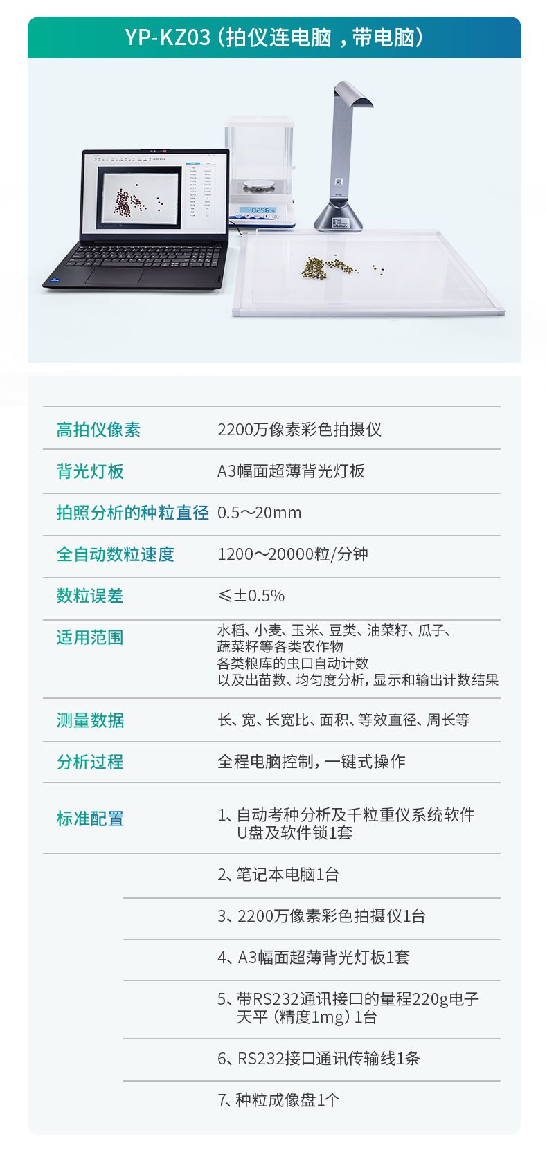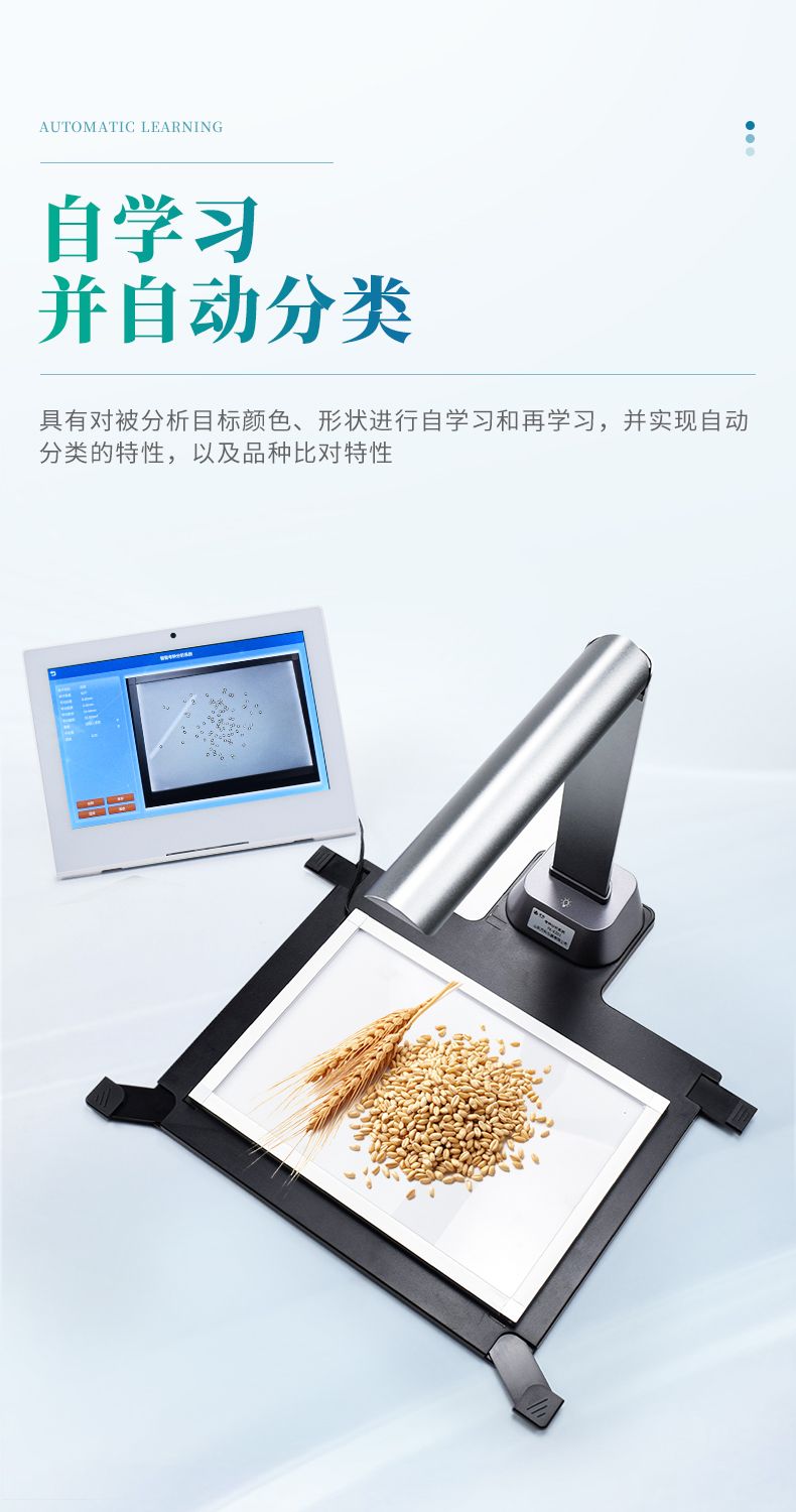 智能考種系統(tǒng)由1600萬(wàn)高拍儀和背光裝置組成。背光裝置采用的是高亮LED燈,外邊框使用鋁合金材質(zhì)制成。軟件采用先進(jìn)的圖像處理技術(shù),根據(jù)距離變換原理、形態(tài)學(xué)、凸包檢測(cè)等技術(shù)綜合設(shè)計(jì)的一款嵌入式軟件。該設(shè)備主要應(yīng)用在農(nóng)業(yè)領(lǐng)域的田間作物測(cè)產(chǎn)及考種等方面,通過(guò)高拍儀拍攝的照片,軟件自動(dòng)計(jì)算種子數(shù)量,種子的面積、周長(zhǎng)、長(zhǎng)度、寬度、長(zhǎng)寬比等數(shù)據(jù),根據(jù)天平所得的重量與種子的數(shù)量自動(dòng)計(jì)算出千粒重;以列表和圖形的方式輸出結(jié)果,便于用戶查看與分析研究。本產(chǎn)品也可以手動(dòng)對(duì)作物種子數(shù)量修正以確保計(jì)數(shù)精度、對(duì)數(shù)據(jù)進(jìn)行保存,并且可以查看數(shù)據(jù)報(bào)表,最后可以將數(shù)據(jù)以Excel格式導(dǎo)出。