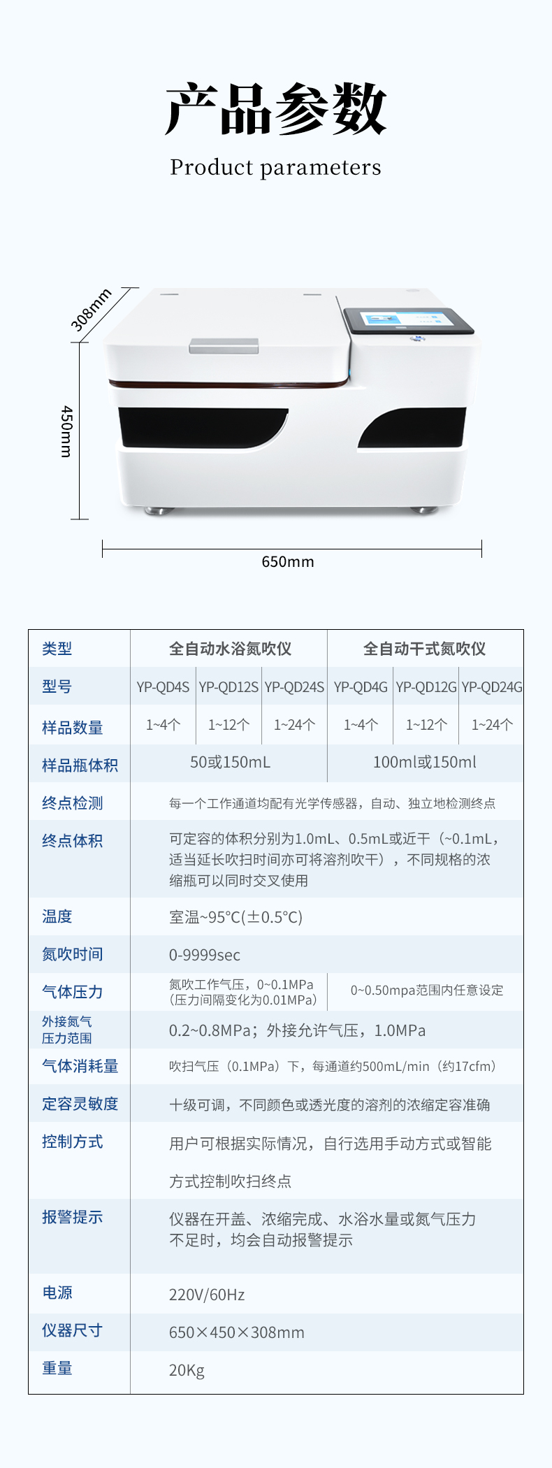 全自動多功能干式氮吹儀YP-QD4G是我司結合實驗室使用需求,從使用者方便安全快捷穩定等多角度共同開發的新型濃縮定容產品,產品擺脫了常規市場上利用水浴加熱揮發而導致樣品進行污染的弊端,確定樣品的安全性與準確性,具有無人值守、準確定容、大批量濃縮的特點,可多組數據儲存功能,實現了全自動化的定量及批量濃縮,濃縮全程,讓繁瑣的濃縮過程變得靈活、省心、高效和安全。