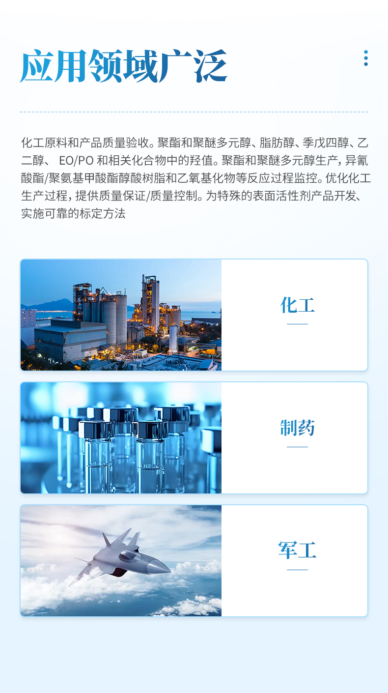 無需樣品處理,操作簡單,快速分析,40秒內完成樣品多組分 同時分析,可分析羥值、碘值、異氰酸含量、胺值、皂化值、 順反比、酸值、過氧化值、水分等性質