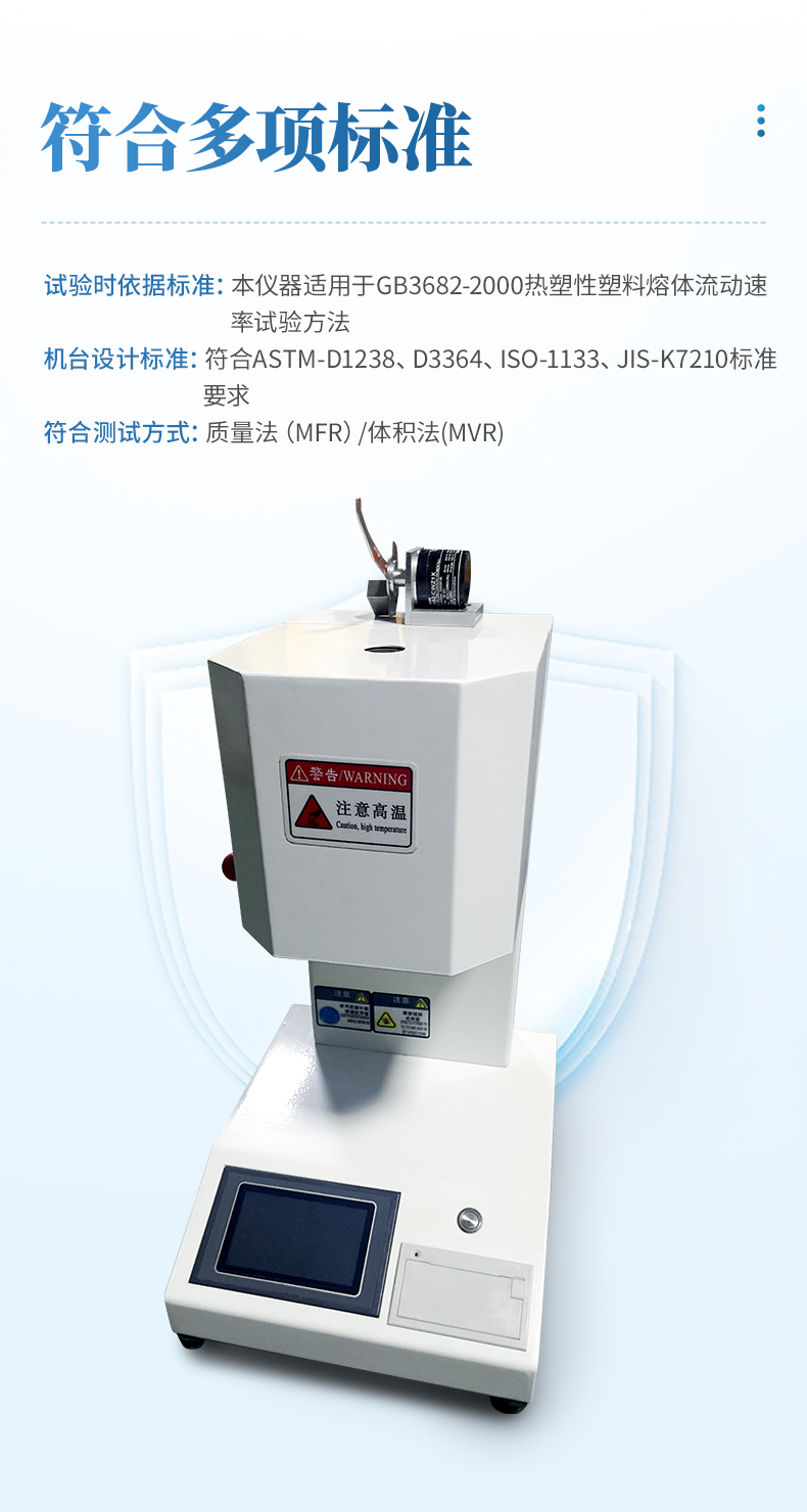 機臺設計標準:符合ASTM-D1238、D3364、ISO-1133、JIS-K7210標準要求。