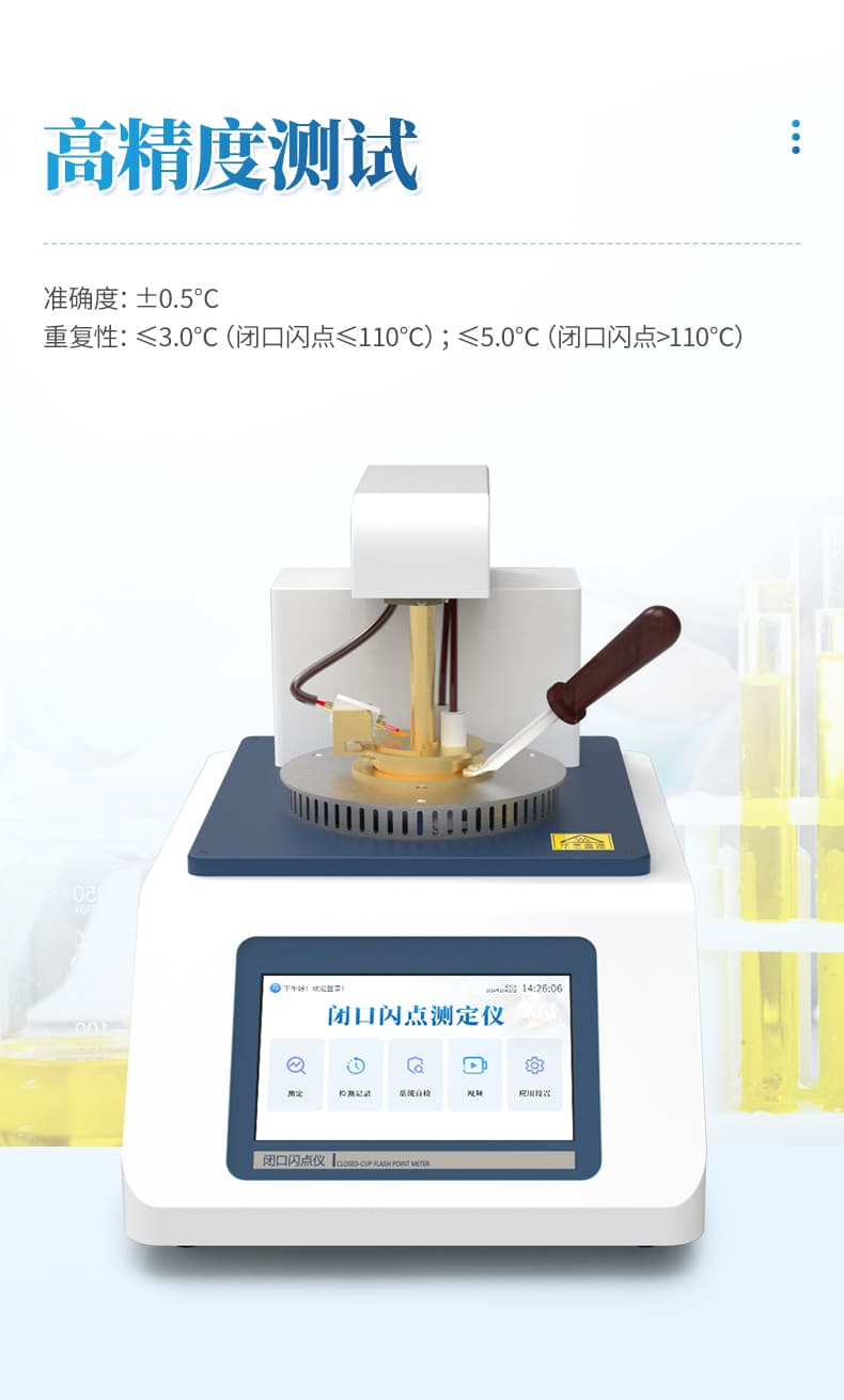 267-88的情況下,連續測試同一樣品,兩者閃點值相差≤4℃。4、自動化程度高。可以自動完成測試過程,自動進行冷卻,自動信息提示等。開口閃點測定儀功能與性能和國內外最高水平接軌,是石油、電力、化工、商檢等行業替代進口產品的專用儀器。