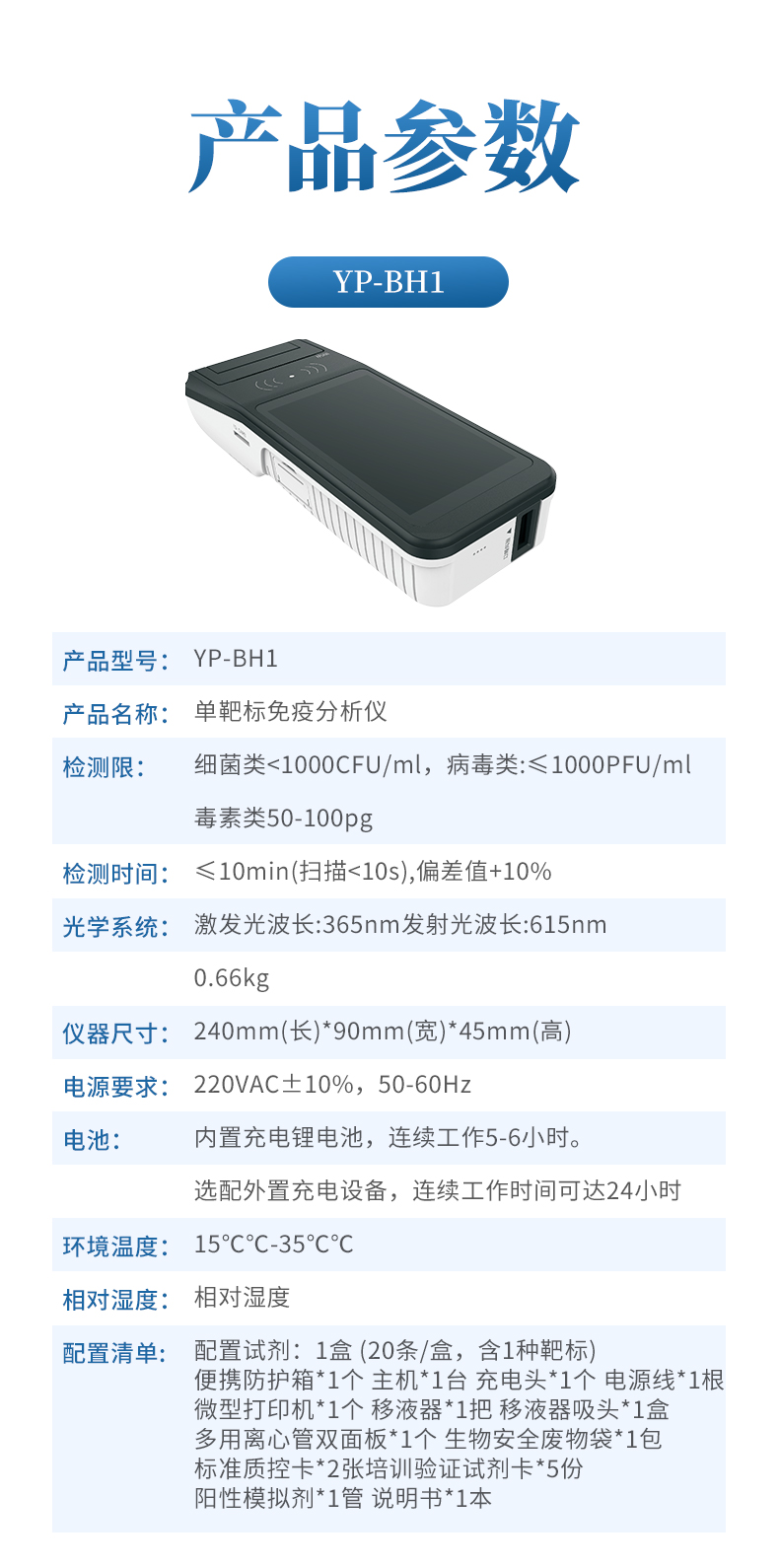 便攜防護箱*1個 主機*1臺 充電頭*1個 電源線*1根 微型打印機*1個 移液器*1把 移液器吸頭*1盒 多用離心管雙面板*1個 生物安全廢物袋*1包 標準質控卡*2張培訓驗證試劑卡*5份 陽性模擬劑*1管 說明書*1本