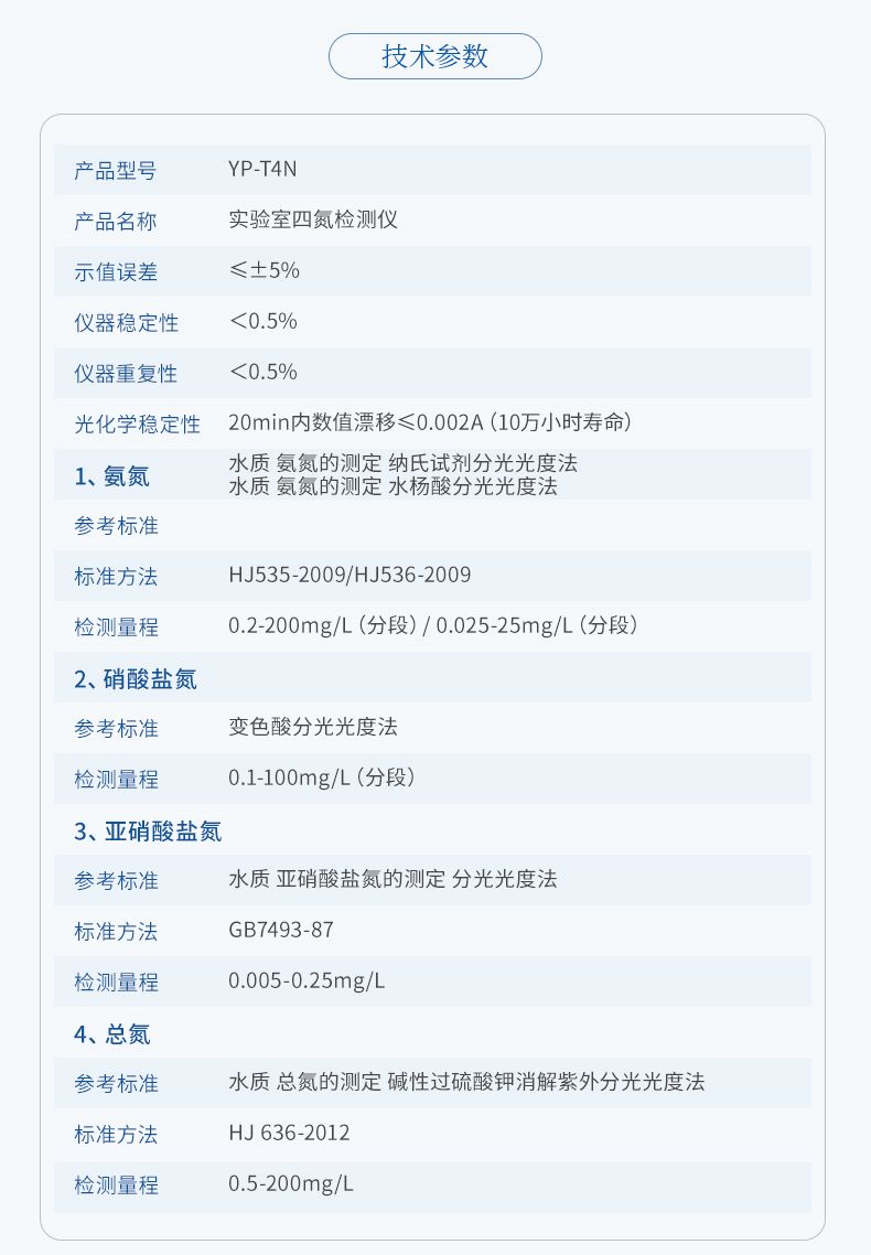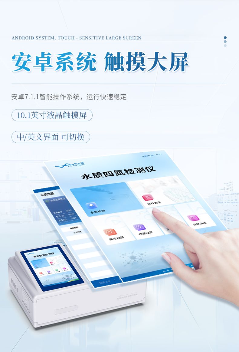 水質四氮檢測儀是參考相關標準研發設計制造,本儀器主要檢測水質氨氮、硝酸鹽氮、亞硝酸鹽氮、總氮濃度指標,兼具智能數據分析功能,圖表、列表顯示數據,分析一目了然;高清晰度彩色液晶觸摸顯示屏,Android智能操作系統,中文顯示界面,中英文鍵盤,人性化操作,使用更簡單。