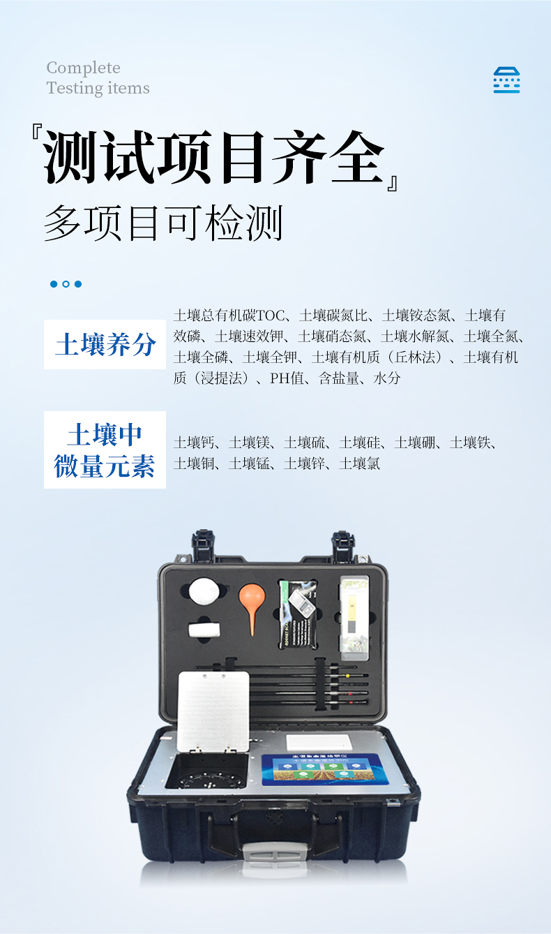 1、土壤養分:●土壤碳氮比、土壤銨態氮、土壤有效磷、土壤速效鉀、土壤硝態氮、土壤水解氮、土壤全氮、土壤全磷、土壤全鉀、土壤有機質(丘林法)、土壤有機質(浸提法)、PH值、含鹽量、水分。●土壤中微量元素:土壤鈣、土壤鎂、土壤硫、土壤硅、土壤硼、土壤鐵、土壤銅、土壤錳、土壤鋅、土壤氯。