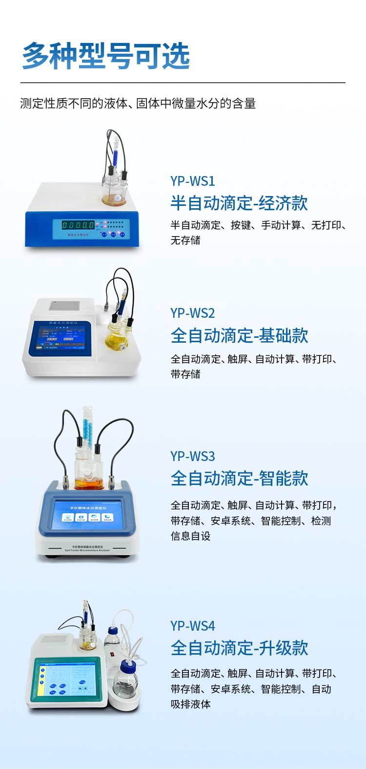 YP-WS1型微量水分測(cè)定儀根據(jù)卡爾-菲休滴定原理,采用先進(jìn)的微機(jī)電路,測(cè)定性質(zhì)不同的液體、固體中微量水分的含量。對(duì)于不溶于試劑的固體,以及與試劑起化學(xué)反應(yīng)的或容易污染電極的物質(zhì),可配用相應(yīng)的固體、液體進(jìn)樣器,進(jìn)行間接測(cè)定。