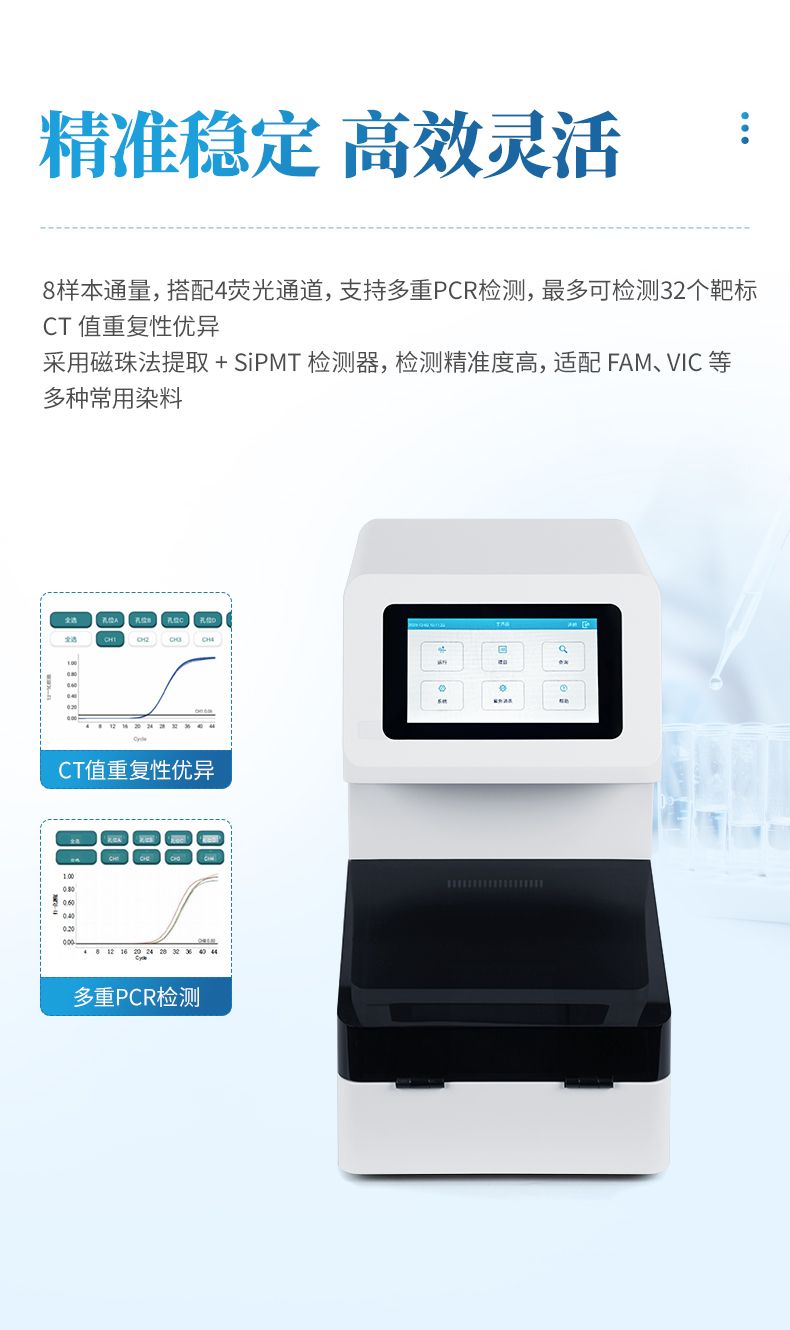 全自動(dòng)核酸檢測(cè)設(shè)備是一款集核酸提取、 PCR擴(kuò)增以及熒光檢測(cè)于一體。儀器配合通用磁珠法核酸提取試劑和熒光定量PCR試劑,一次實(shí)驗(yàn)可支持8個(gè)樣本的QPCR檢測(cè)。用戶(hù)只需加入樣本,無(wú)需轉(zhuǎn)管,配液等復(fù)雜操作,可大大降低人工操作,